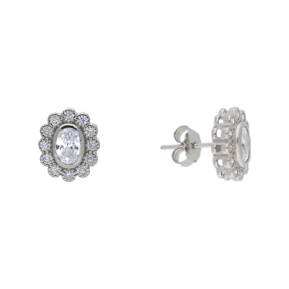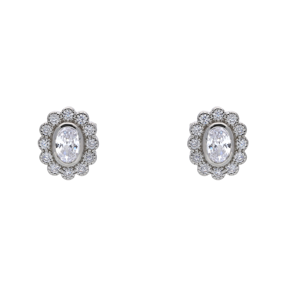 These elegant stud earrings feature an oval-cut centre stone, available in vibrant imitation-emerald green, deep blue imitation-sapphire, or classic clear cubic zirconia. Each framed by a refined scalloped halo of sparkling cubic zirconia stones. Made in polished sterling silver, the design measures approximately 1cm from top to bottom, offering a timeless touch of sparkle suited to both everyday wear and special occasions.
