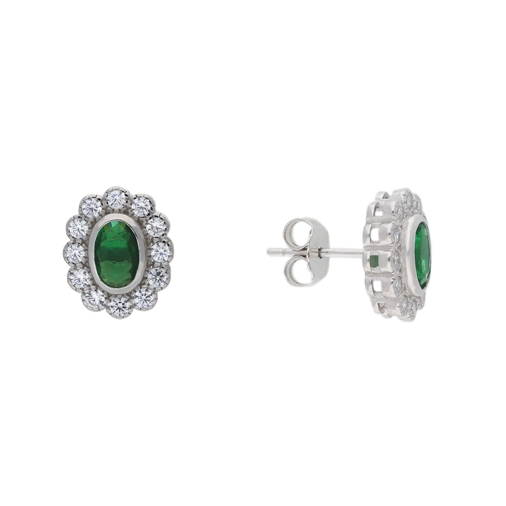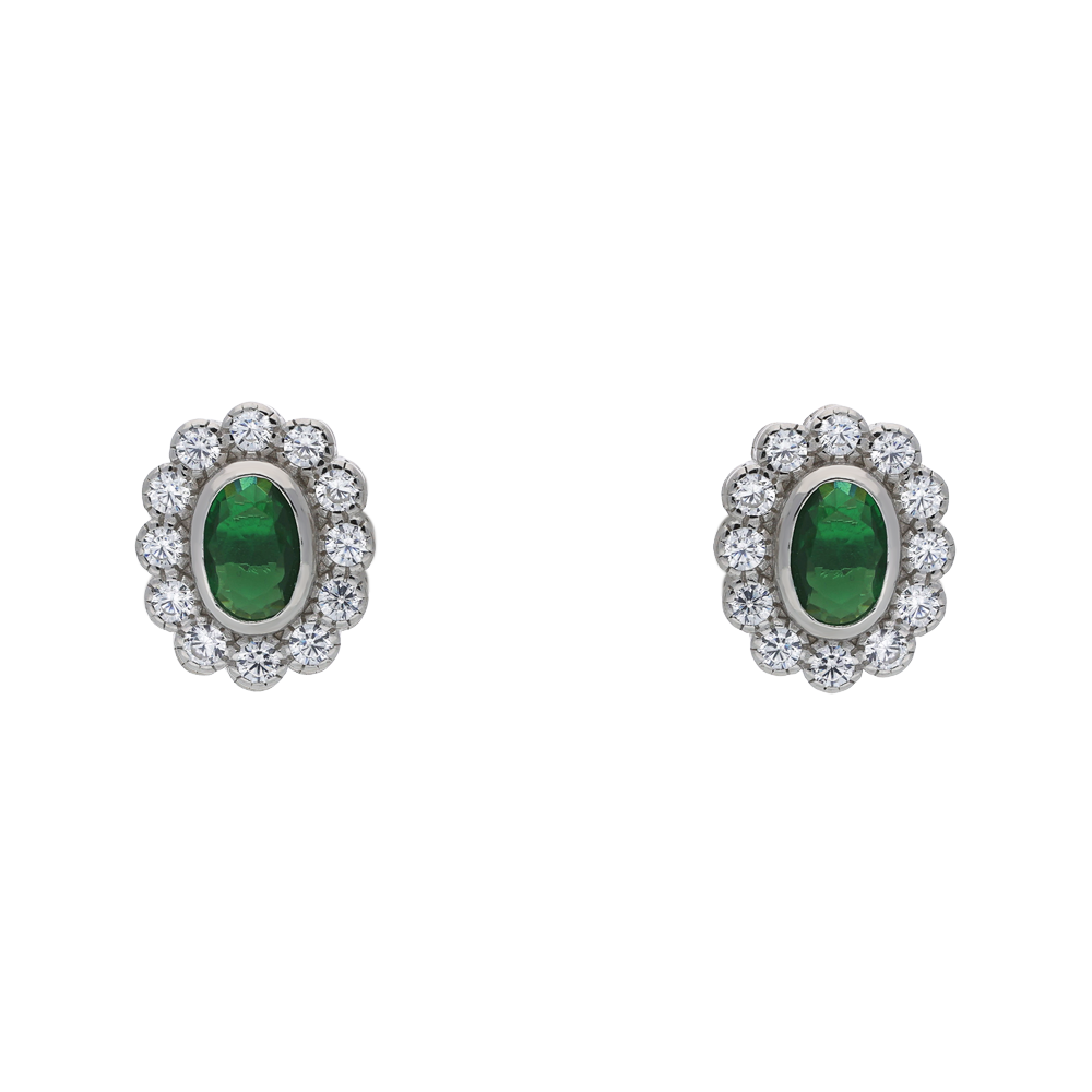 These elegant stud earrings feature an oval-cut centre stone, available in vibrant imitation-emerald green, deep blue imitation-sapphire, or classic clear cubic zirconia. Each framed by a refined scalloped halo of sparkling cubic zirconia stones. Made in polished sterling silver, the design measures approximately 1cm from top to bottom, offering a timeless touch of sparkle suited to both everyday wear and special occasions.