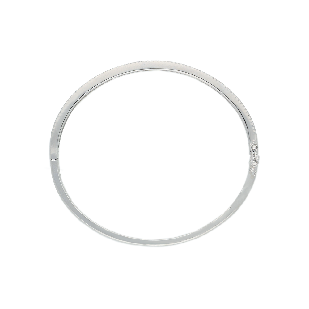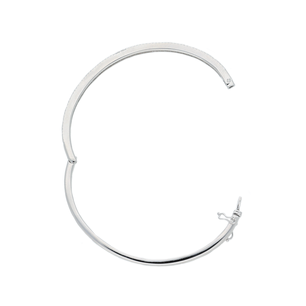 Sparkle with our beautiful cubic zirconia bangle. Made with sterling silver, it features three rows of dazzling cubic zirconia 3mm in width. A centre row of larger cubic zirconia stones is encased in two rows of smaller stones above and below. Perfect for adding an extra bit of sparkle to any outfit or occasion.