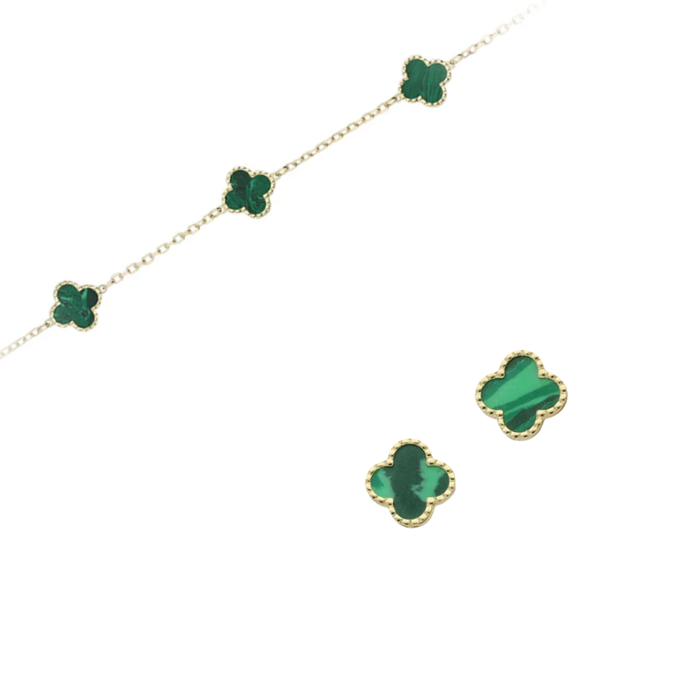 9ct Yellow Gold Malachite Clover Bracelet and Earrings