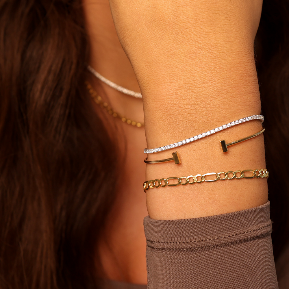 This 9ct yellow gold bracelet features a classic Figaro link design, combining elongated and shorter links for a timeless, sophisticated look. Measuring 19cm, it offers a comfortable fit with a polished finish that enhances the rich golden hue.