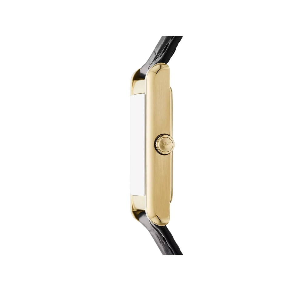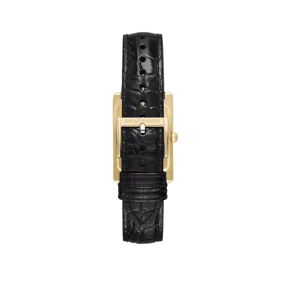 The Emporio Armani 25mm Black Leather Watch brings refined elegance to a compact design. Featuring a 25mm gold-toned stainless steel rectangular case, its paired with a black crocodile-pattern leather strap for a sleek look. The matching black dial enhances its modern appeal, while the reliable quartz movement ensures accurate timekeeping. With 50 meters water resistance, the watch blends classic style with everyday practicality.