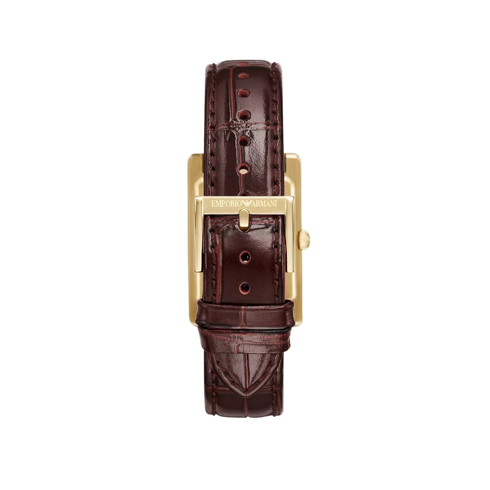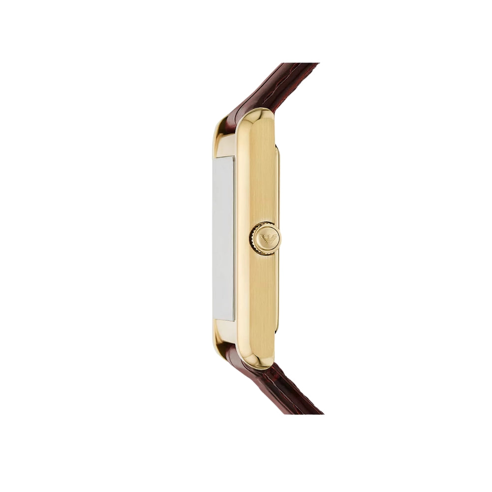 The Emporio Armani 25mm Brown Leather Watch is a refined timepiece that embodies classic sophistication. Featuring a 25mm gold-toned stainless steel rectangular case, its paired with a brown crocodile-pattern leather strap. The clean white dial adds a touch of understated charm, while the reliable quartz movement ensures precise and effortless timekeeping. With 50 meters of water resistance, this watch offers both style and practicality.