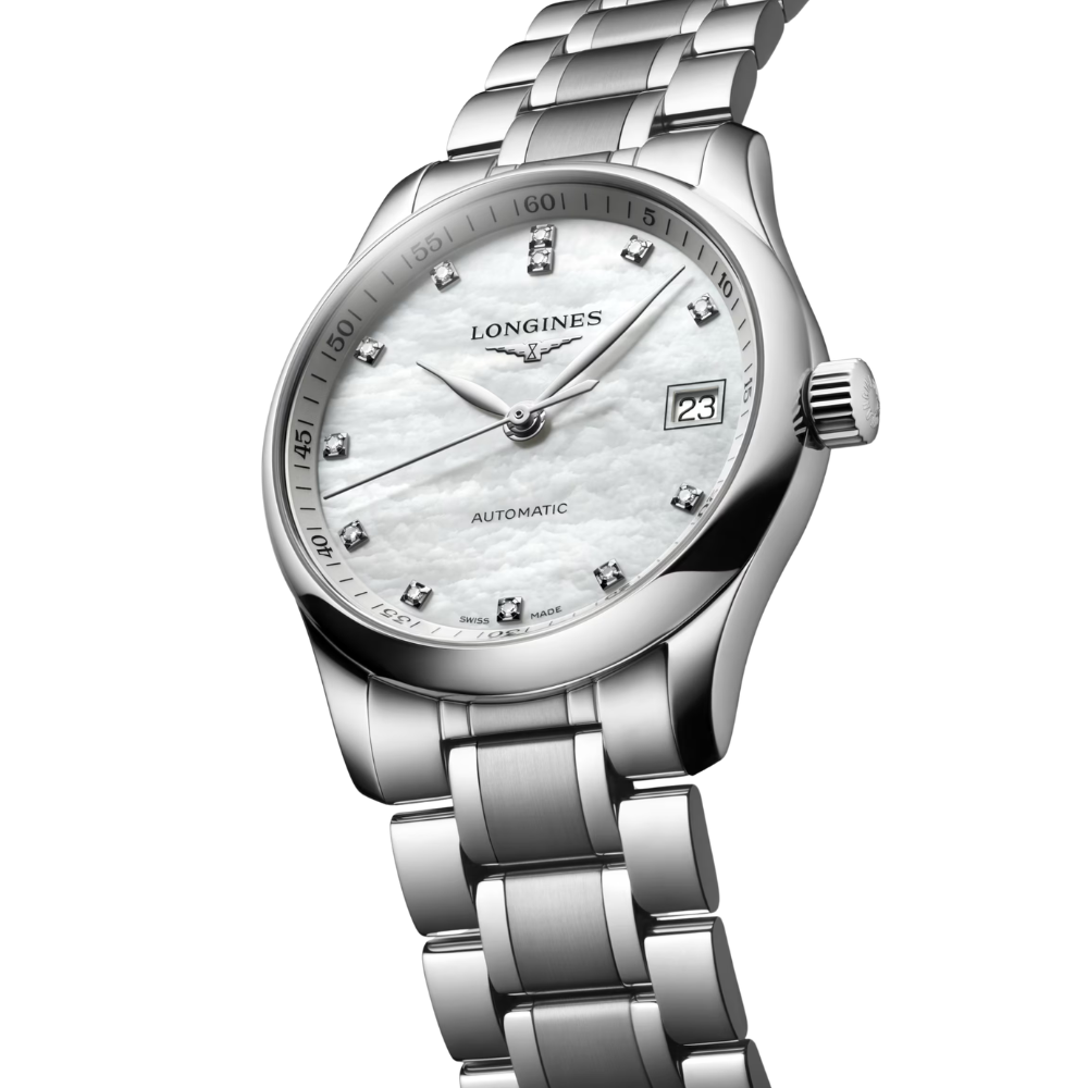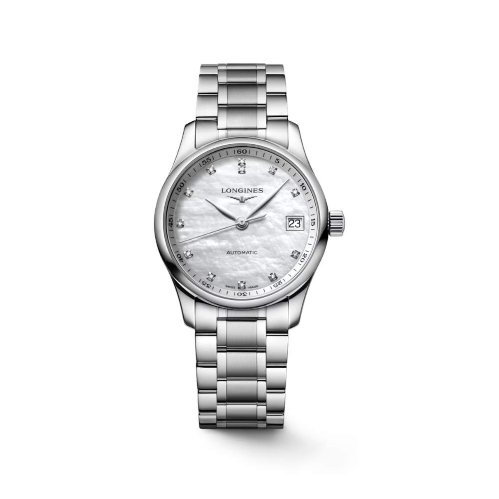 This reference from the Master Collection features a 34 mm stainless steel case paired with a mother-of-pearl dial that provides subtle visual depth. The dial is set with diamond indexes, offering legible time indication with applied markers. A date aperture is positioned at 3 o’clock.