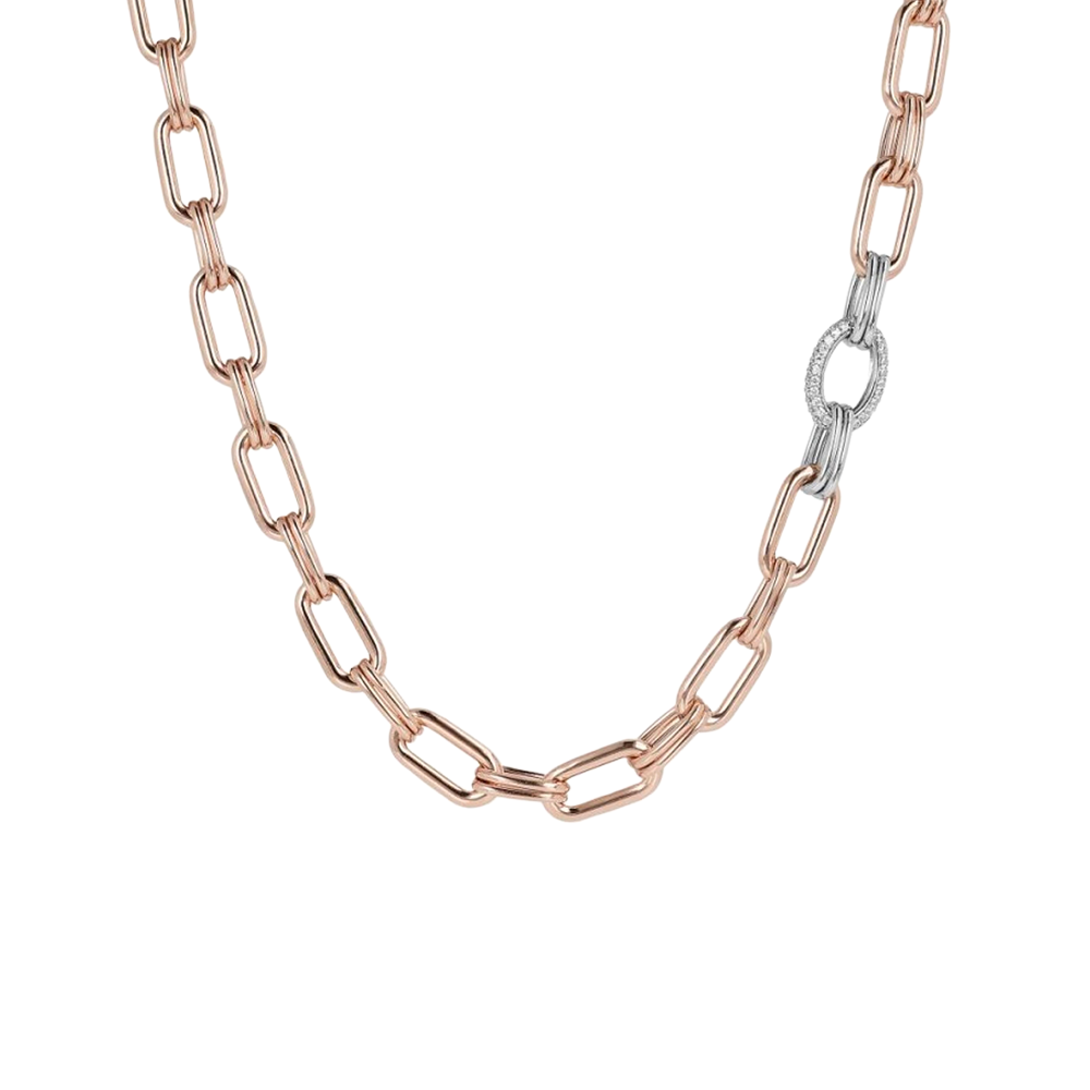 This Bronzallure necklace is crafted in a rose gold plated finish and defined by its distinctive mixed oval link design. The chain features alternating double oval links and larger single oval links, creating texture and visual interest while maintaining a refined, balanced silhouette.