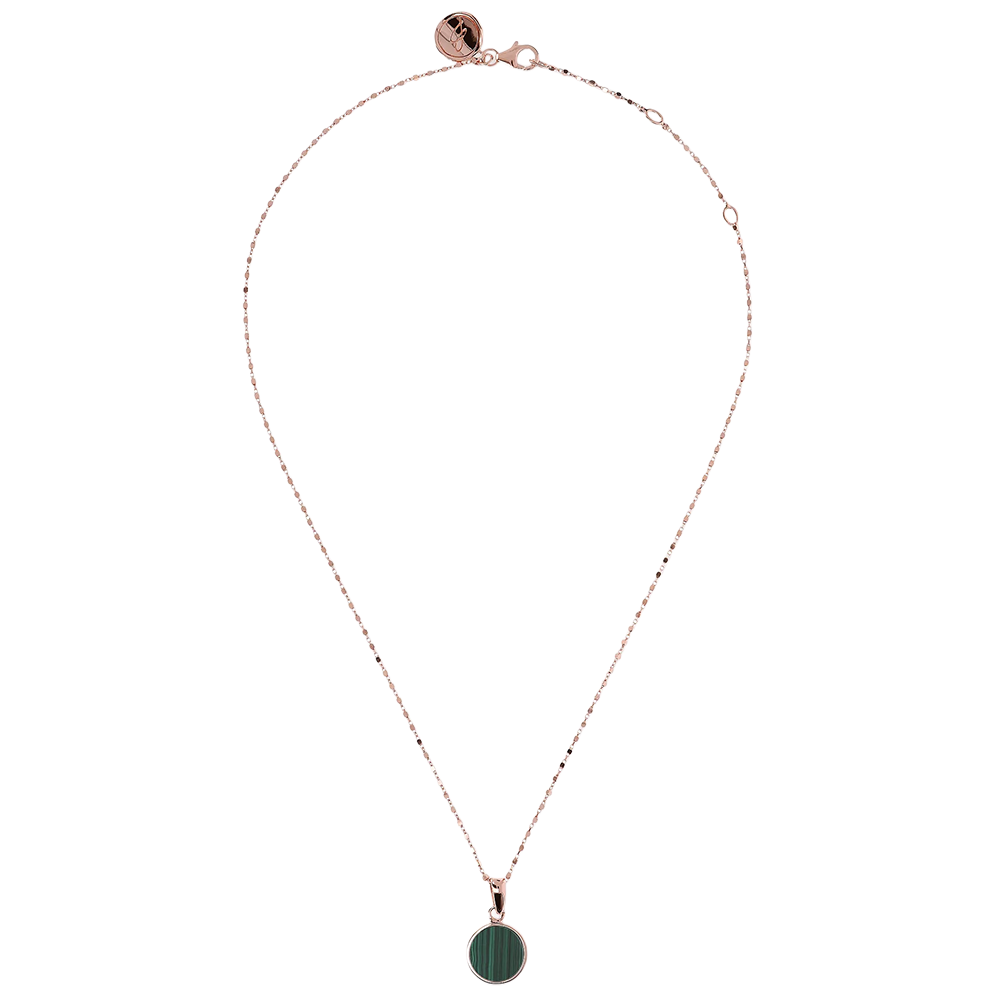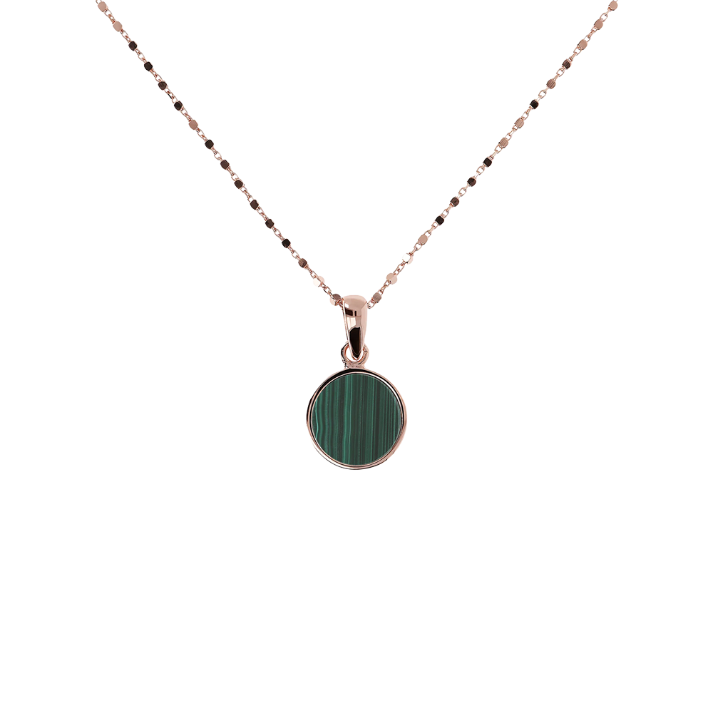 This rose gold plated pendant by Bronze Allure features a round 14 mm disc in mother of pearl or malachite, set in a smooth bezel setting. The pendant is suspended from a contemporary cube-style rose gold plated chain, adding subtle texture and definition to the design.