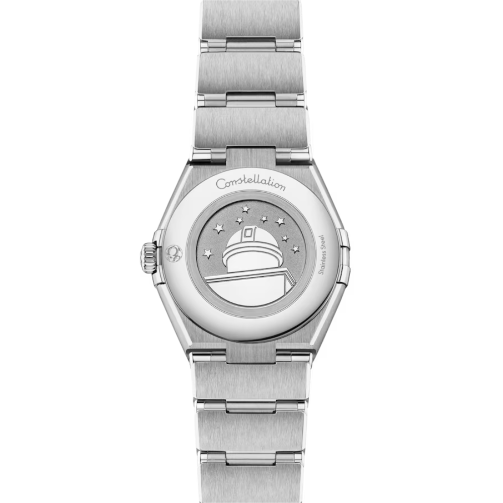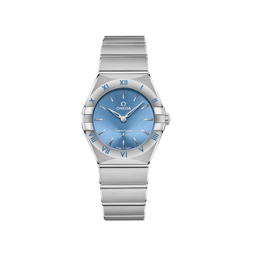 This sophisticated 28mm model is made in stainless steel, showcasing a celestial blue dial enriched with 18ct white gold hands, indexes, and applied detailing. The bezel features engraved Roman numerals enhanced in a soft blue shade. Powering this timepiece is the OMEGA Calibre 4061 quartz movement, designed with OMEGA’s “Long Life” feature to extend battery performance. The caseback reveals the emblematic Constellation Observatory medallion, an enduring symbol of the collection’s heritage.