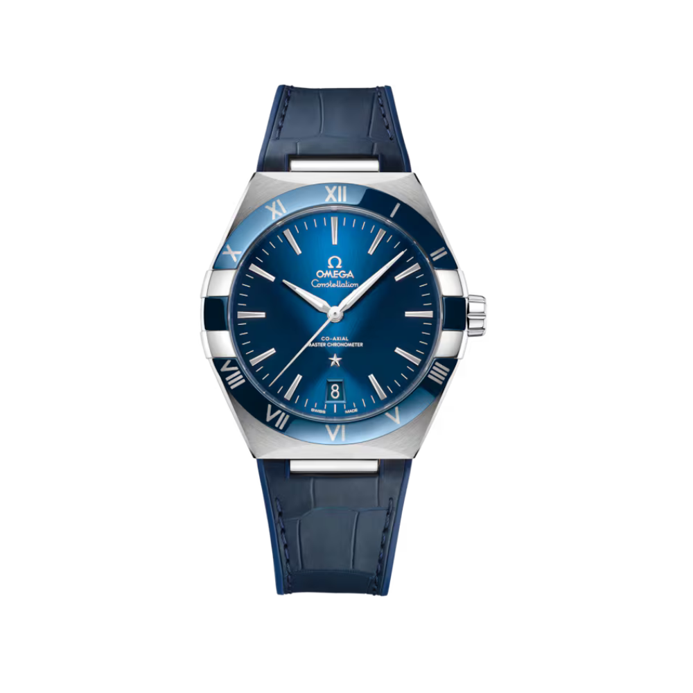 This sophisticated 41mm model is made in stainless stell and framed by a polished blue ceramic bezel, enhanced with Roman numerals in OMEGA's cutting-edge Liquidmetal™. The sun-brushed blue dial delivers depth and texture, complete with a date window at 6 o'clock. Rhodium-plated hands, facetted indexes, OMEGA logo and Constellation star create contrast against the blue base. The watch is presented on a premium blue leather strap with a rubber lining. Inside, the OMEGA Co-Axial Master Chronometer Calibre 8900 powers the piece, certified to the highest standards of accuracy and magnetic-resistance.