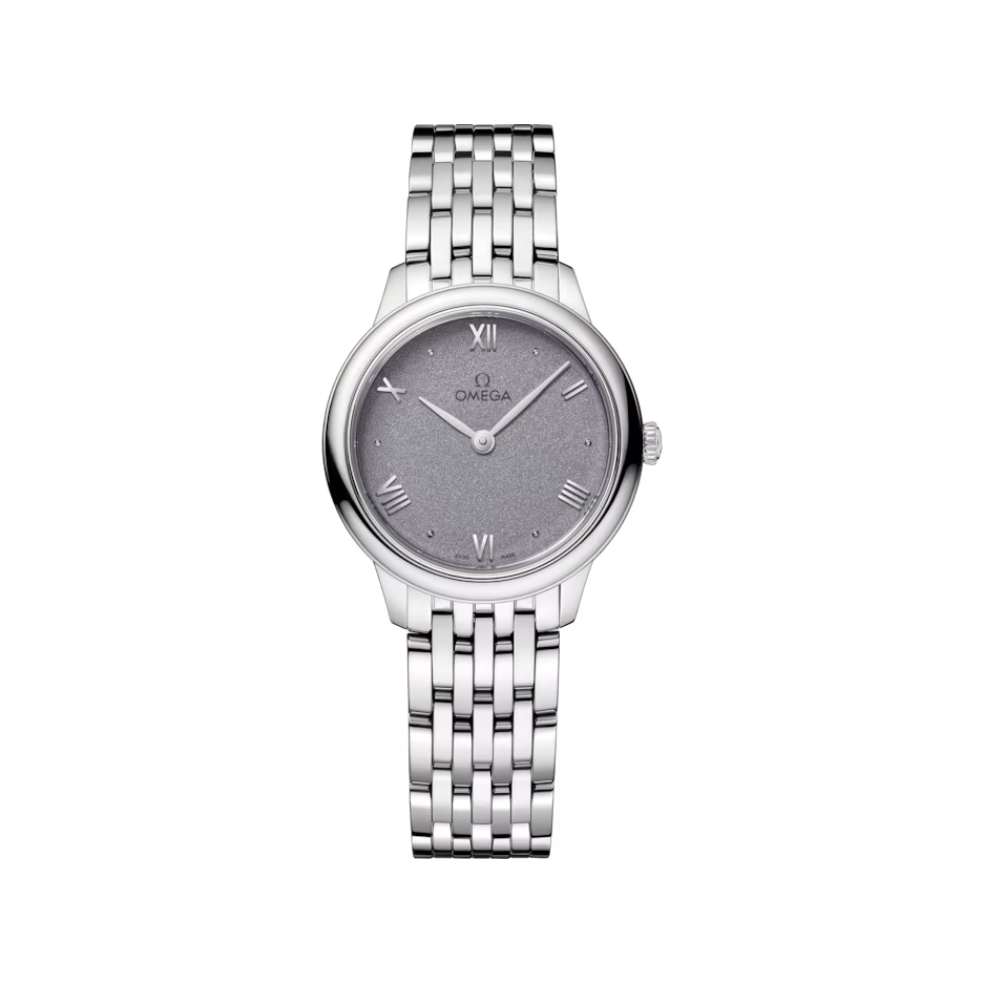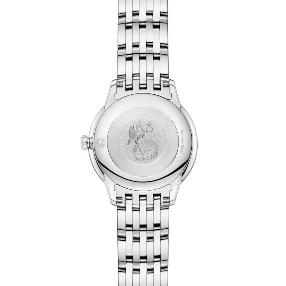 This 27.5mm stainless-steel features a striking PVD lavender dial with a crystal finish that catches and reflects the light beautifully. The dial is enhanced by rhodium-plated hands and a charming combination of Roman numerals and cabochon indexes. The full stainless-steel caseback is embossed with the emblematic God Chronos medallion, a signature detail of the De Ville Prestige family.