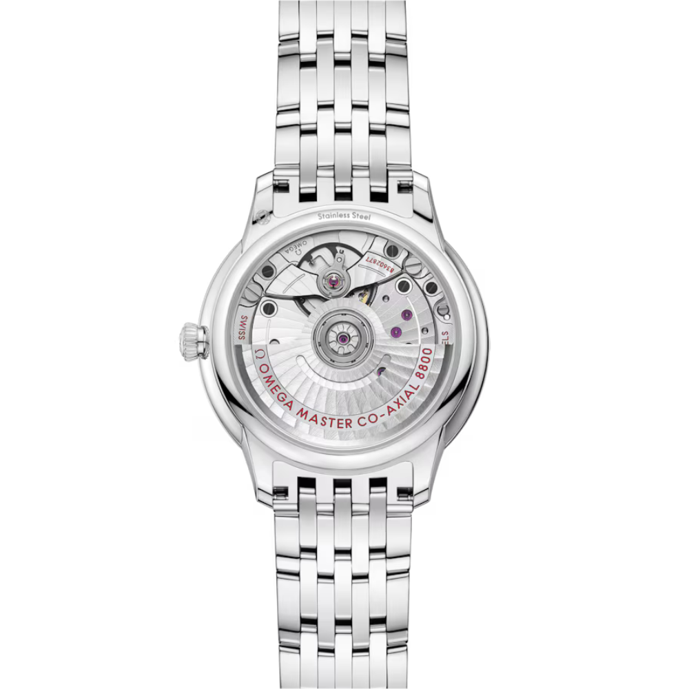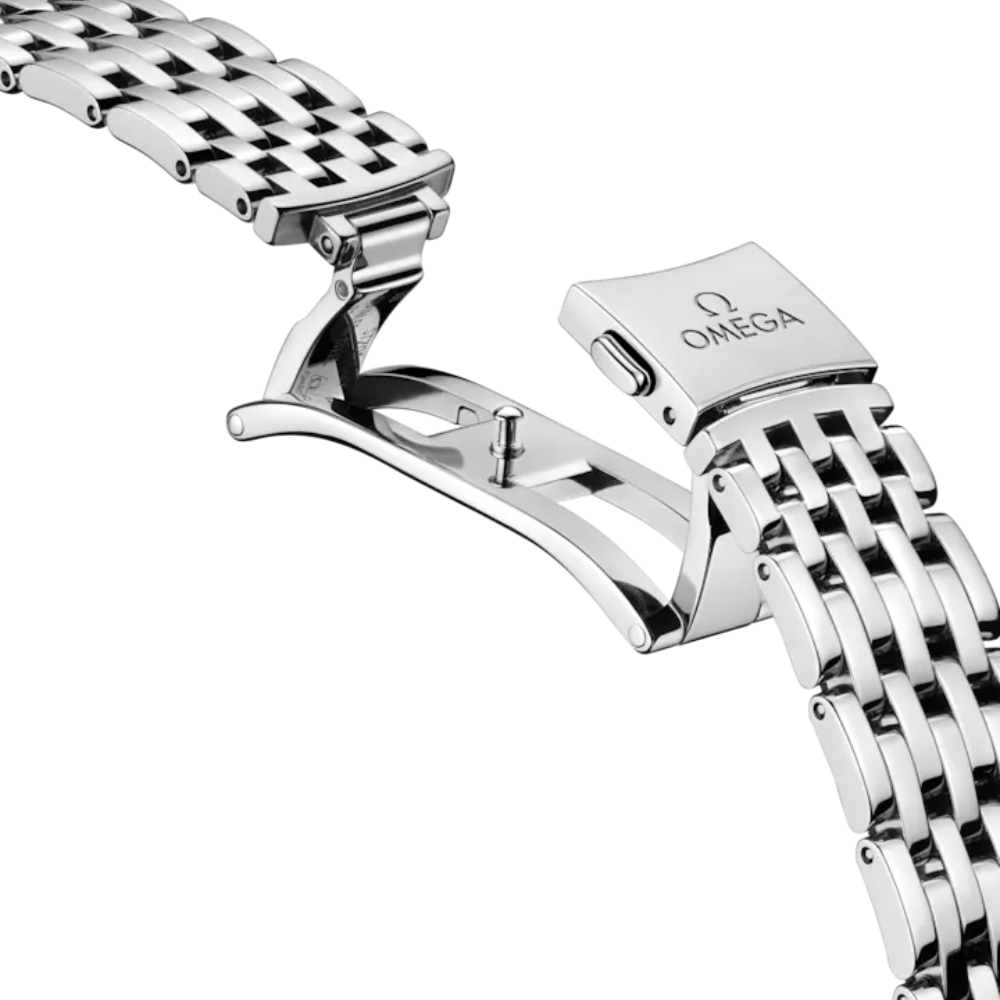This 34mm stainless-steel model captures the essence of the line with its balanced proportions and classically inspired detailing. The PVD blue dial features a stamped vertical pattern enhanced by a sun-brushed finish. Rhodium-plated hands complement the alternating Roman numerals and cabochon indexes, offering a harmonious blend of tradition and modernity. A date window at 6 o'clock and dotted minute track on the outer zone complete the timepiece. Presented on a polished and brushed stainless-steel bracelet, this timepiece is powered by the OMEGA Master Co-Axial Calibre 8800.