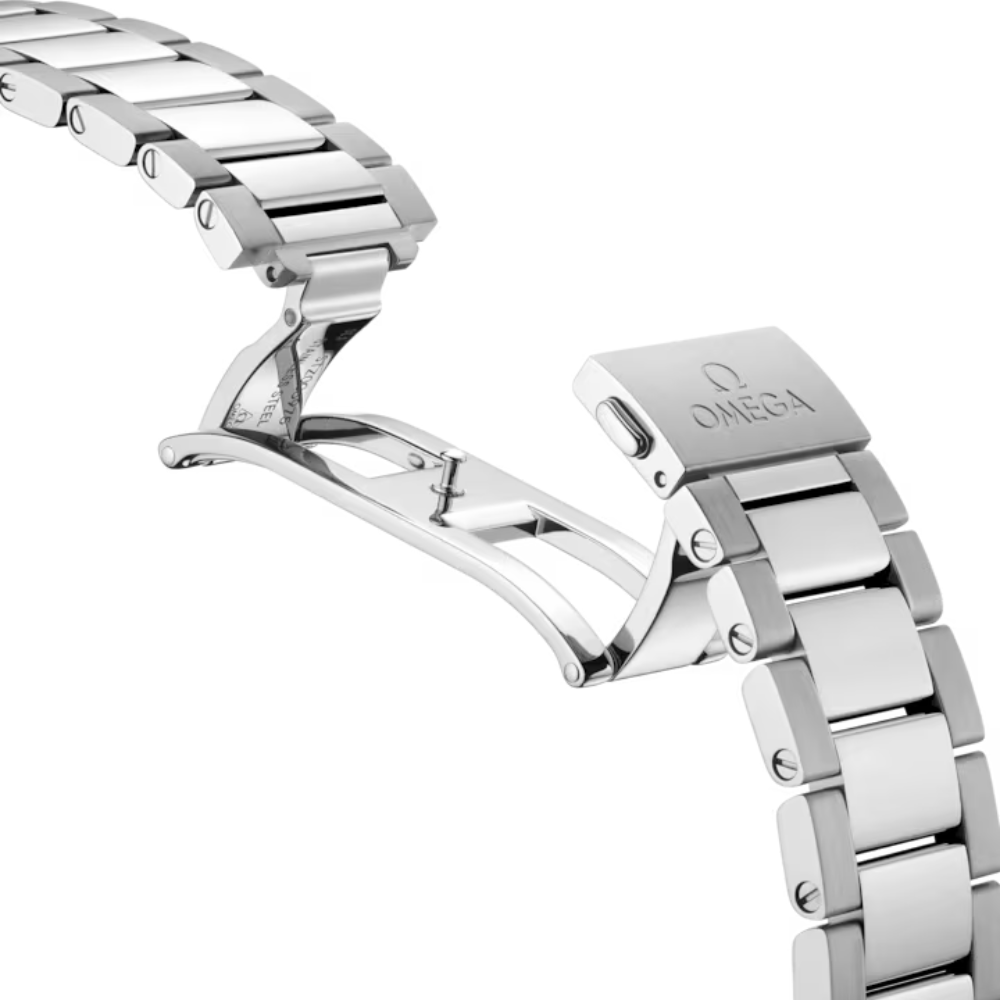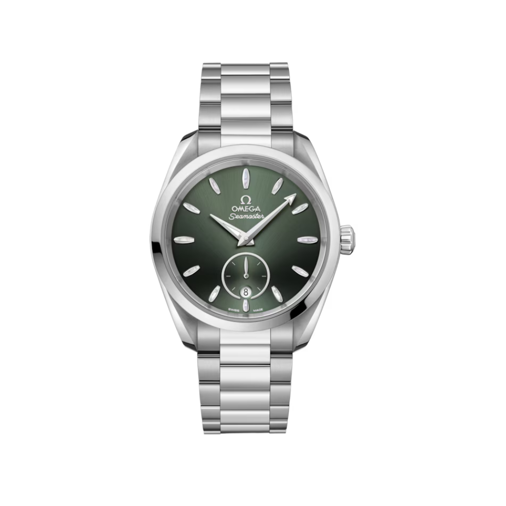 The sun-brushed dark green dial introduces depth, colour, and sophistication. It showcases a date window at 6 o'clock and a Small Seconds subdial framed by an 18ct white gold ring. The rhodium-plated hands are filled with white Super-LumiNova for enhanced visibility, while the 18ct white gold indexes are shaped like sailboat hulls and set with mother-of-pearl inlays. Presented on a polished and brushed stainless-steel bracelet, this timepiece is powered by the OMEGA Co-Axial Master Chronometer Calibre 8802. Certified by METAS to the industry’s highest standards, it guarantees outstanding precision, magnetic resistance, and performance.