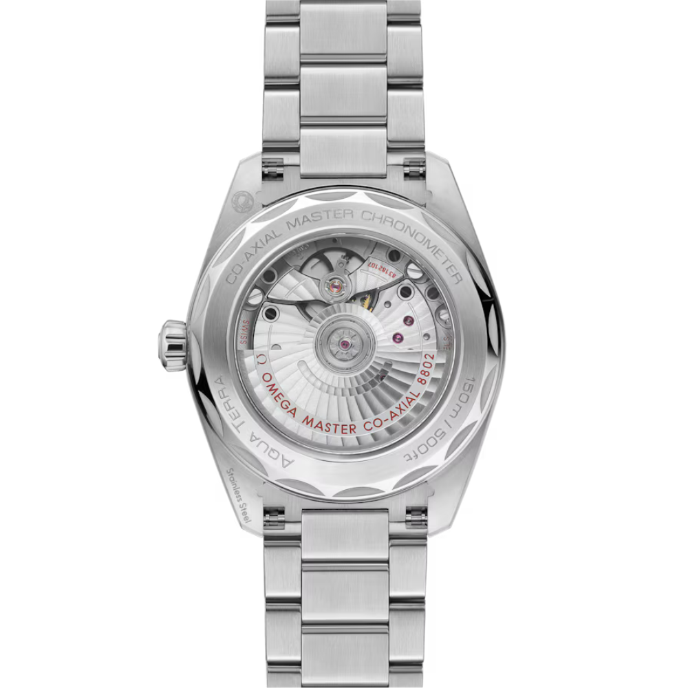 The Seamaster Aqua Terra blends nautical inspiration with exceptional watchmaking precision. This 38mm model features a stainless-steel case, enhanced by a wave-edged design on the caseback, a nod to its ocean heritage.