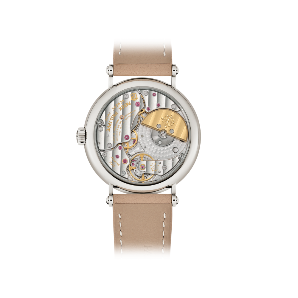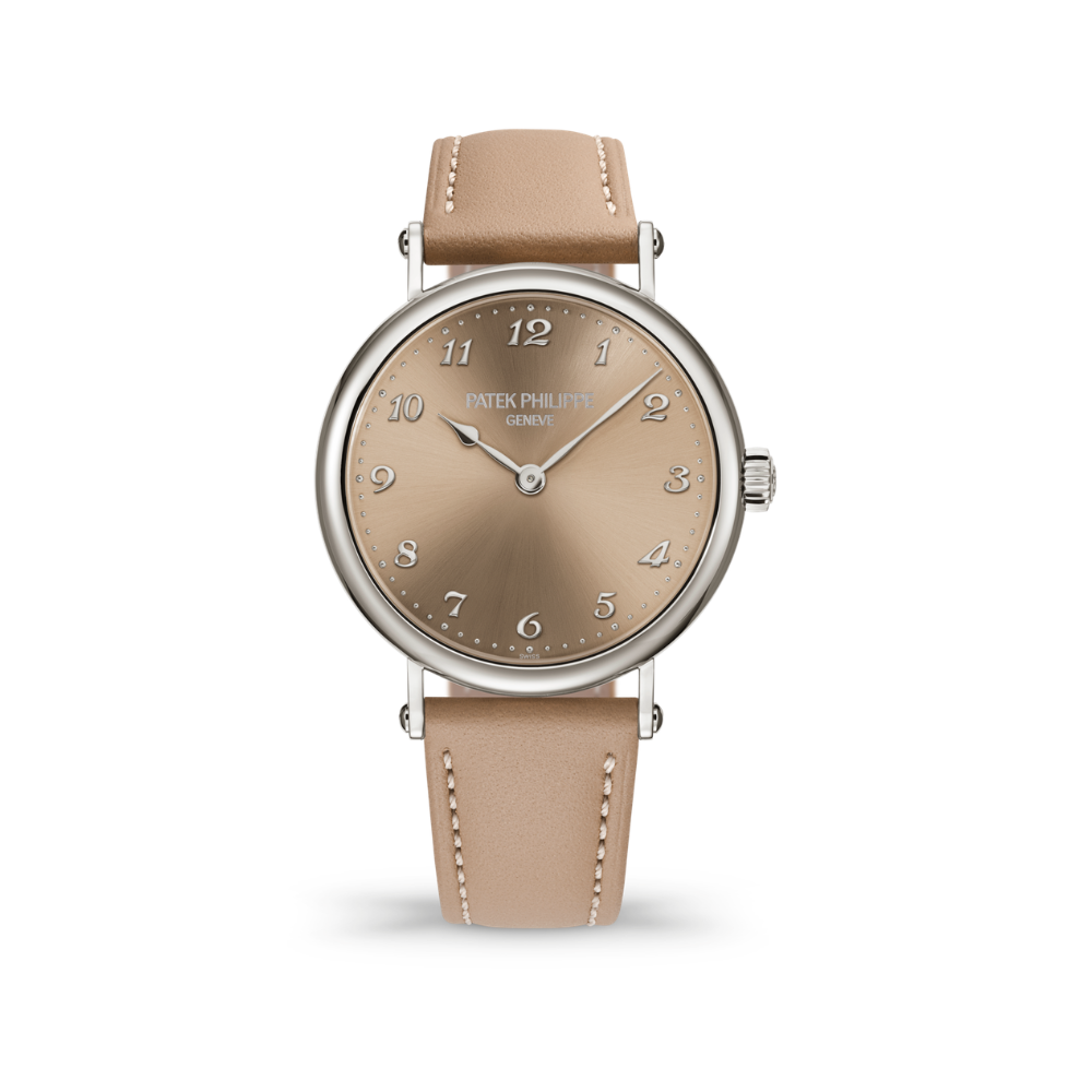 A white gold Calatrava with sunburst sand beige dial and sand-toned calfskin strap