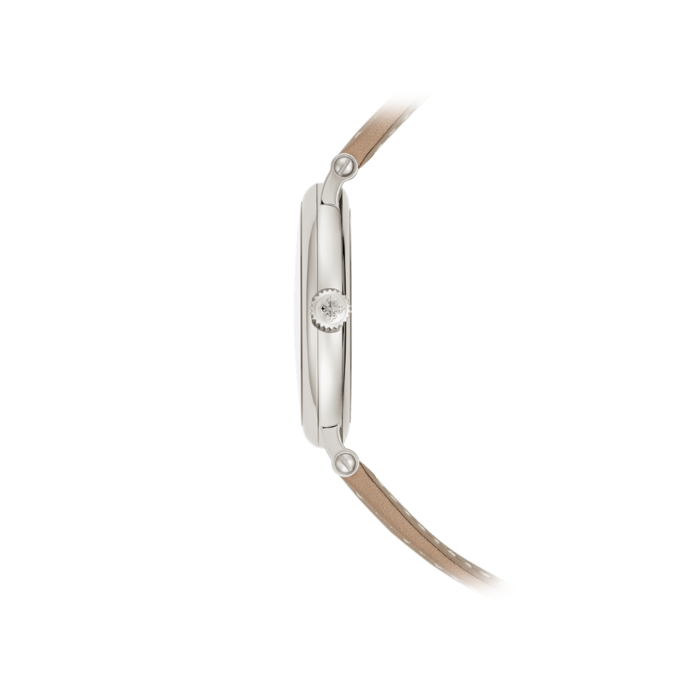 Patek Philippe presents Ref. 7200/50G-001, a refined ladies’ Calatrava in a fully polished 34.6mm white gold Officer’s-style case with straight lugs and screw-down bars, paired with a sunburst sand beige dial. The warm dial tone is complemented by Breguet-style applied numerals, pear-shaped white gold hands, and cabochon-style minute markers for enhanced legibility, while a matching sand calfskin strap reinforces the cohesive aesthetic. Powered by the ultra-thin self-winding 240 calibre with off-centre 22K gold mini-rotor, the 7.37mm case maintains a slim profile, with the movement’s architecture and Patek Philippe Seal finishing visible through a sapphire case back.
