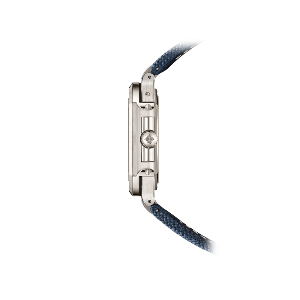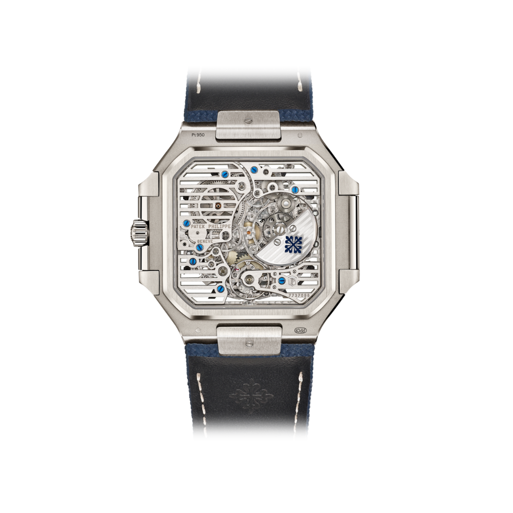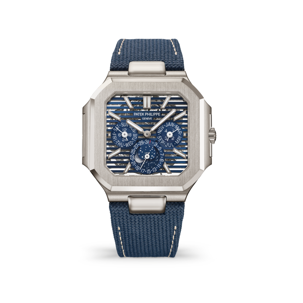 Patek Philippe expands its Cubitus collection with Reference 5840P-001, a bold “elegant sports” interpretation featuring its first Grand Complication perpetual calendar. Housed in a 45mm platinum case, the design is defined by an open worked blue dial with Cubitus’ signature linear pattern, revealing the skeletonised movement beneath while maintaining strong legibility through luminescent white gold markers and hands. A high-definition moon phase display adds depth and realism, while the navy composite strap reinforces its contemporary character. Powered by the square-shaped 28-28 Q SQU self-winding calibre, this 313-component movement showcases a monochrome aesthetic with refined blue accents and can be admired through a sapphire case back, reflecting a seamless integration of technical mastery and modern design.
