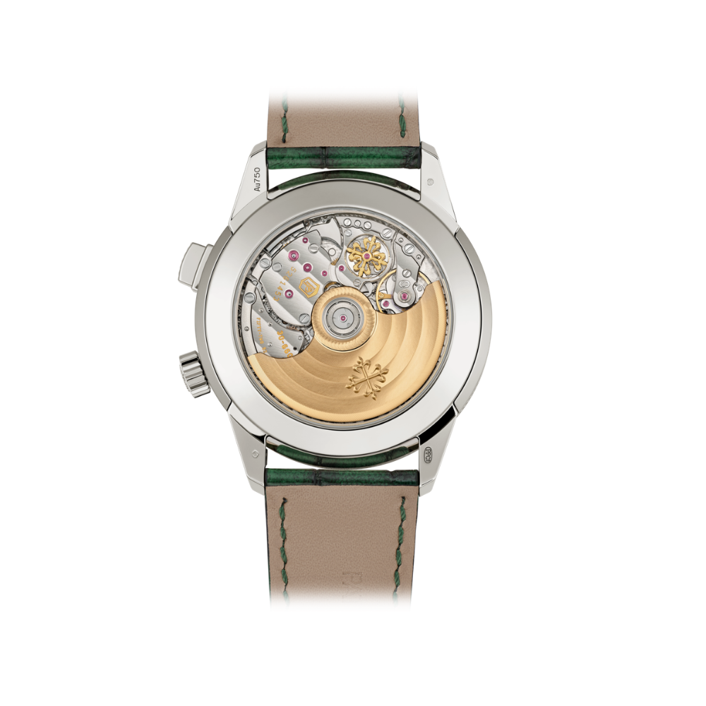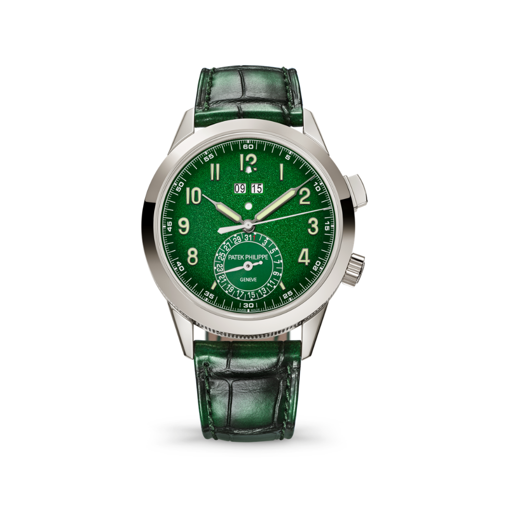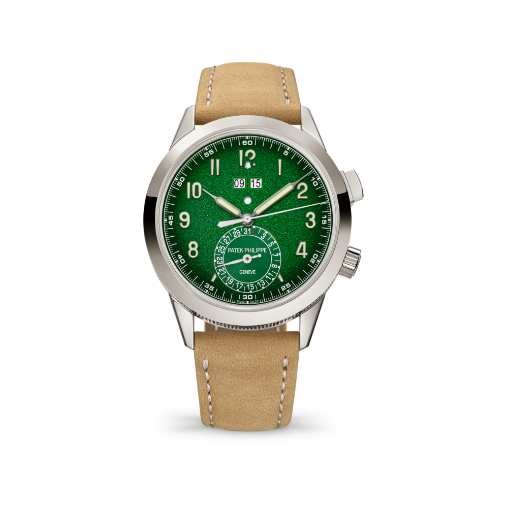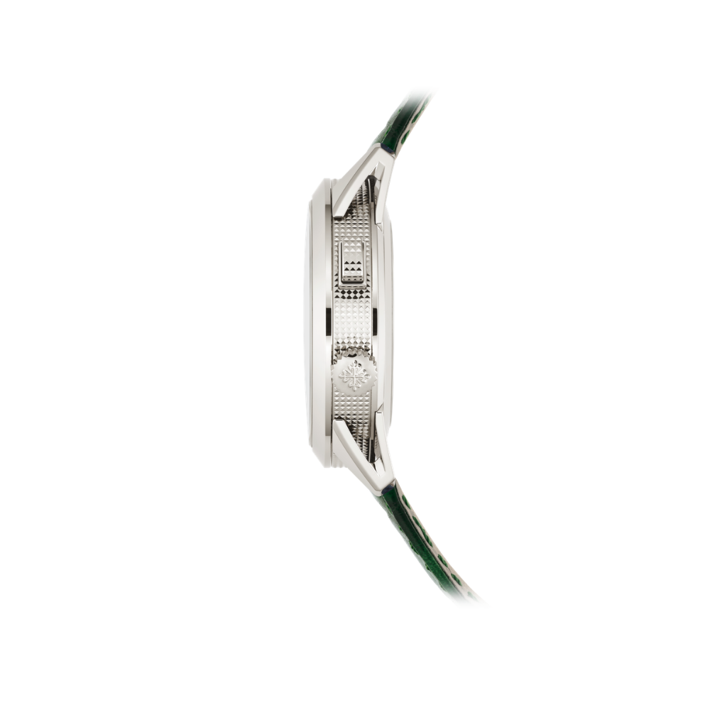This contemporary white gold Calatrava by Patek Philippe combines the signature “Clous de Paris” hobnail pattern with a textured green lacquered dial, housing an iconic 24-hour alarm complication for intuitive use. The 41mm case features hollowed lugs, a pusher at 2 o’clock, and a crown uniquely positioned at 4 o’clock, while the dial presents luminescent Arabic numerals, a subdial date, and clearly arranged alarm indicators including day/night and activation status. The only water-resistant chiming watch in the collection, it is paired with interchangeable alligator and calfskin straps and secured by a patented fold-over clasp. At its core, the self-winding AL 30-660 S C calibre delivers a refined gong-struck alarm regulated by an inertial flywheel for consistent sound, with 524 components contained within an ultra-slim 6.6mm movement, visible through a sapphire case back.