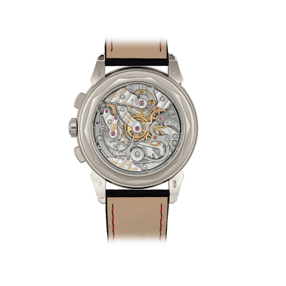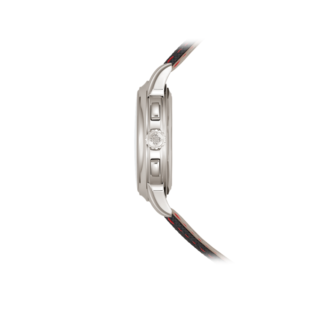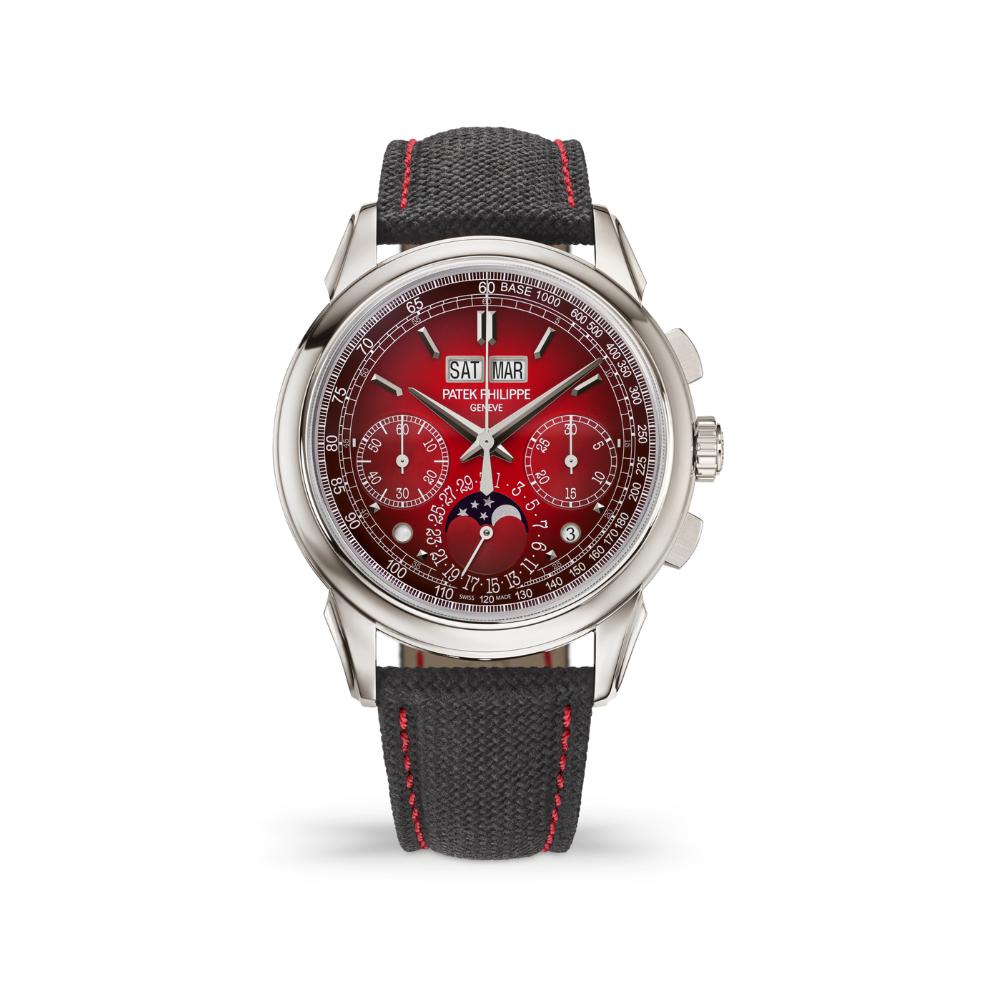 Patek Philippe revisits its celebrated 5270 perpetual calendar chronograph in platinum, now presented with a bold red lacquered dial. First introduced in 2011 and rooted in the legacy of the 1941 Ref. 1518, this 41mm timepiece balances refined elegance with high complication, featuring a concave bezel, stepped lugs, and a discreet diamond set between the lugs. The dial offers a clear perpetual calendar display with day and month apertures, date and moon phases, as well as day/night and leap year indicators, complemented by a tachymeter scale. Powered by the manually wound CH 29-535 PS Q calibre, this sophisticated movement combines traditional architecture with six patented innovations and an ultra-thin calendar mechanism, with its 456 components visible through a sapphire case back.