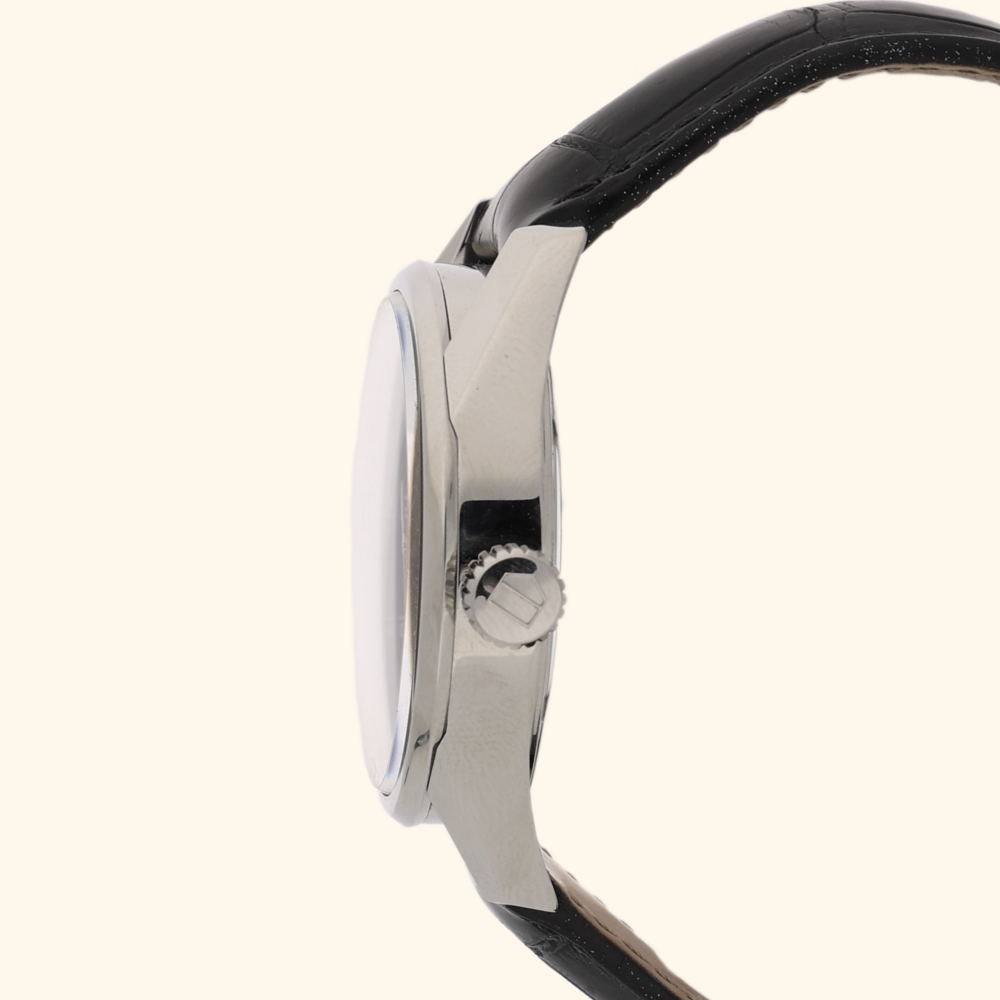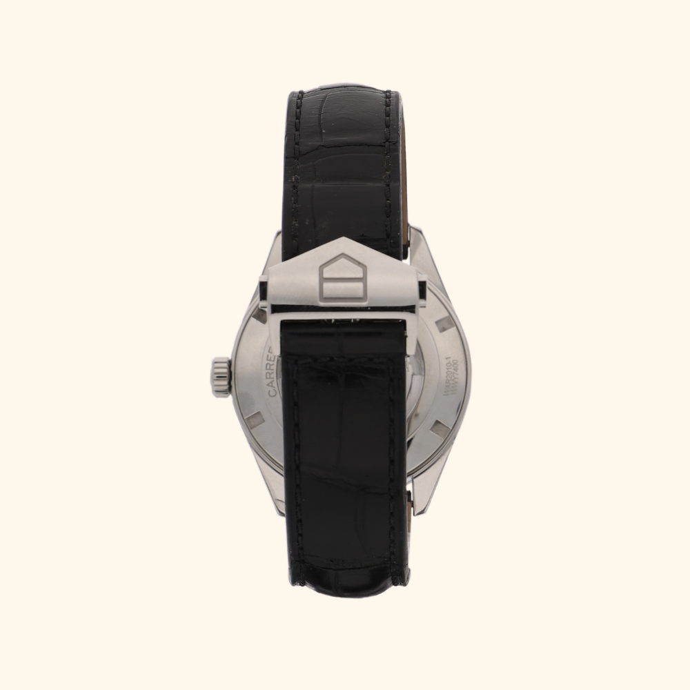 This Pre-Owned TAG Heuer Carrera 41mm reflects the clean, performance-driven design that defines the Carrera collection. Crafted in stainless steel with a 41mm case, it offers a confident yet versatile presence on the wrist. The black dial enhances its understated, sporty aesthetic, complemented by a black leather strap for a refined finish. Powered by an automatic movement with a 50-hour power reserve, this timepiece delivers reliable mechanical performance suited to everyday wear.