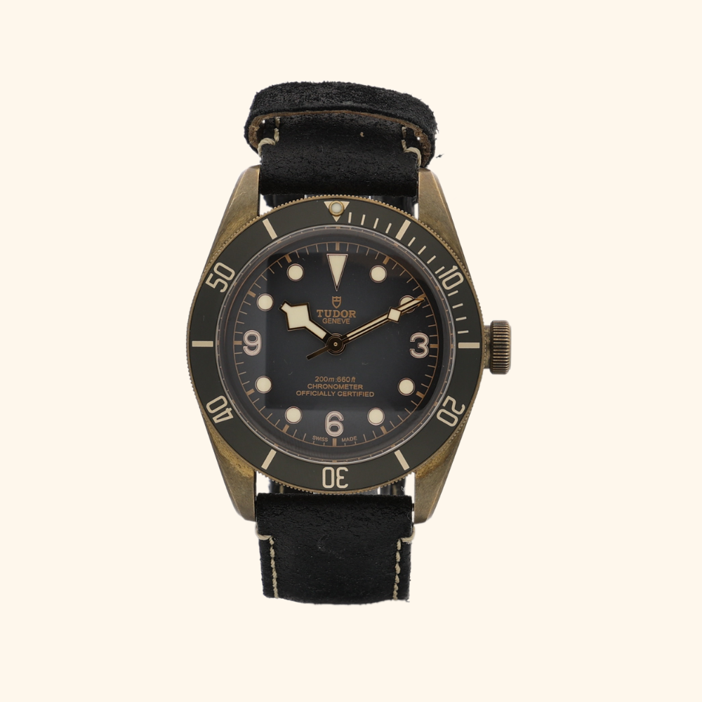 A standout in TUDOR’s Black Bay collection, this pre-owned 43mm Bronze Black Bay is both bold and elegant. Made in 2022, it features a slate grey dial with luminous markers and hands, offering excellent legibility.