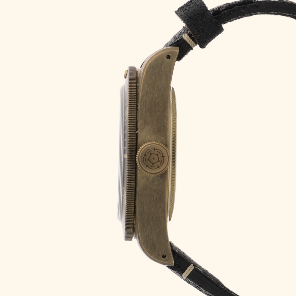 Housed in a warm bronze case that develops a unique patina over time, this model exudes character and individuality. The watch is paired with a black leather strap, combining sophistication with comfort.