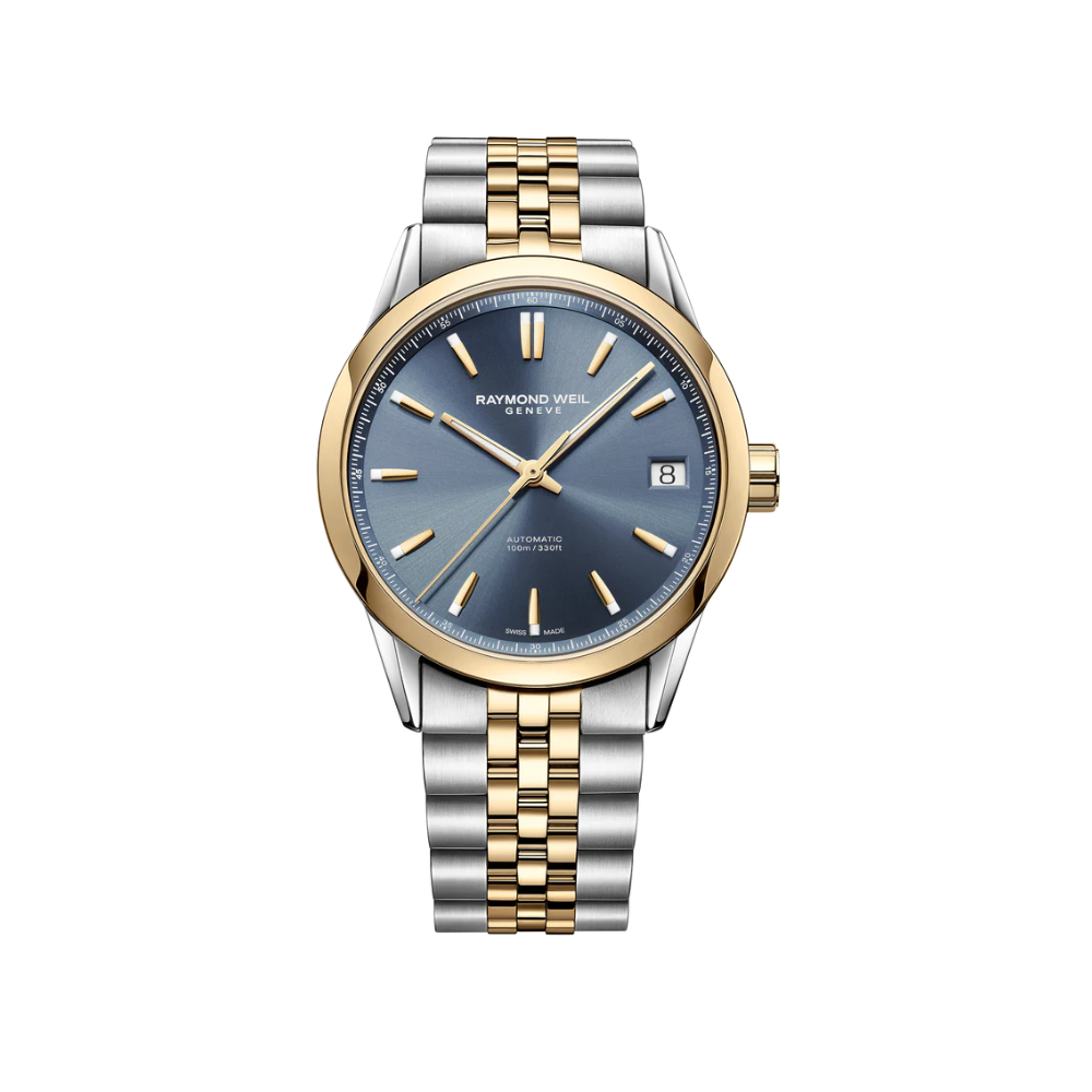The Raymod Weil Freelancer Mixed Bracelet showcases a refined 40mm two-tone stainless-steel case and bracelet, offering a sophisticated yet versatile look. Its striking blue dial adds depth and character, while the automatic movement delivers precise timekeeping with a 41-hour power reserve. Finished with 100 meters of water resistance, this timepiece blends Swiss craftmanship with everyday practicality.
