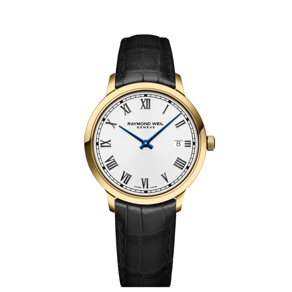 The Raymond Weil Toccata Classic 39mm Black Leather Watch features a yellow gold PVD case paired with a black leather strap, creating a refined and timeless look. Its white dial is complemented by elegant blue hands, adding a subtle touch of contrast and character. Powered by a precise quartz movement and offering 50 meters of water resistance, this watch is a sophisticated choice for both everyday wear and formal occasions.