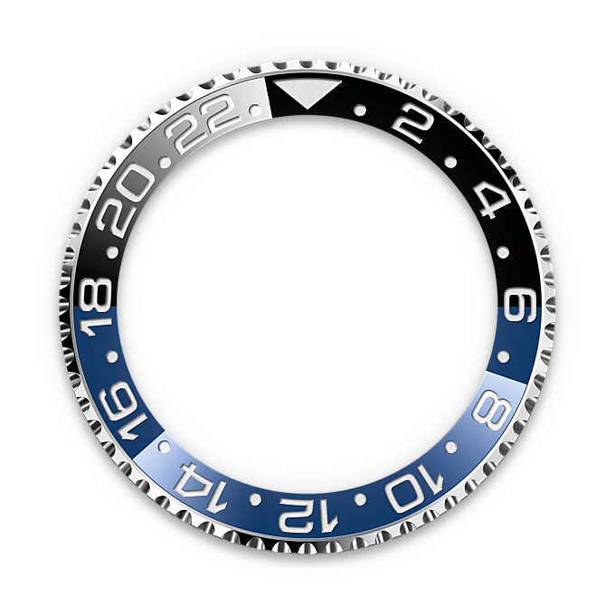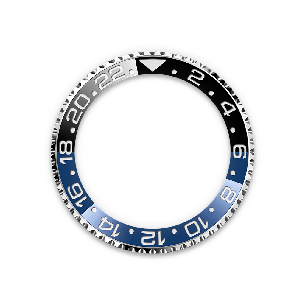 Bidirectional rotatable 24-hour graduated bezel. Two-colour blue and black Cerachrom insert in ceramic, moulded numerals and graduations