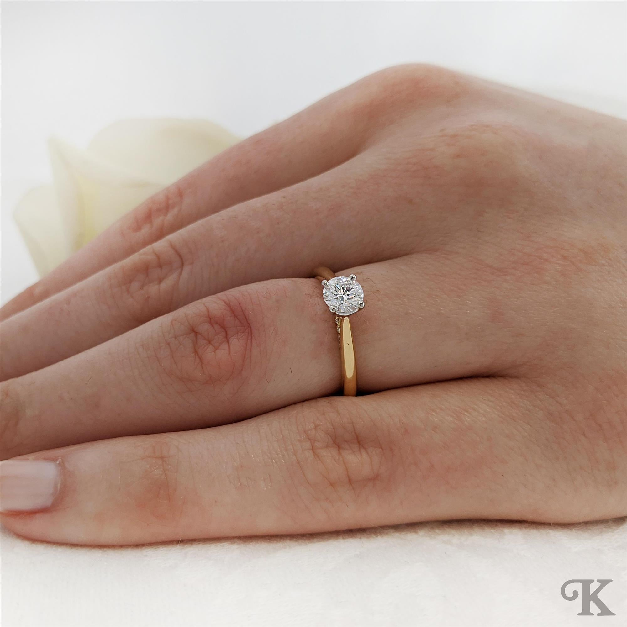 18ct Yellow Gold Shank and Platinum Head Solitaire Solitaire Round cut Diamond engagement ring in a Platinum Claw Set on a 18ct Yellow Gold Plain Band 0.60ct total G Colour