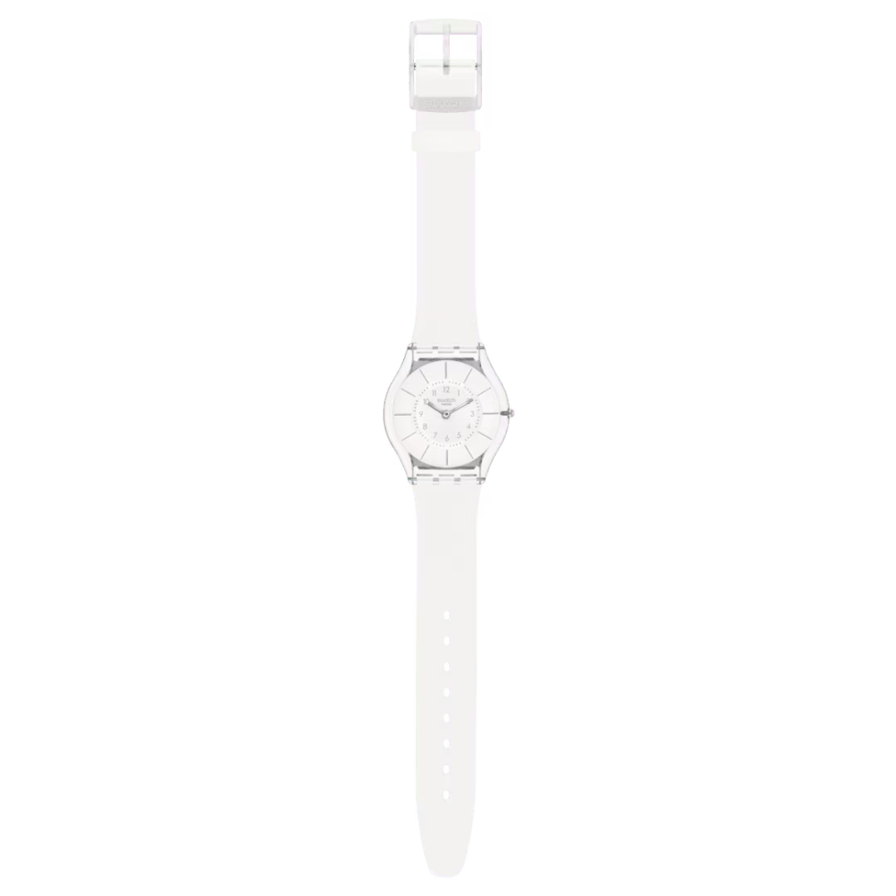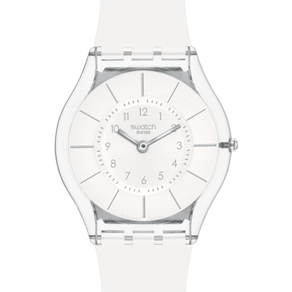 The Swatch White Classiness watch I an ultra-thin 34mm timepiece featuring a crisp white dial accented with shiny silver-coloured indexes and protected by bio-sourced glass. The transparent clear bio-sourced case is paired with a white strap and matching loop, while a clear buckle completes the refined, minimalist design.