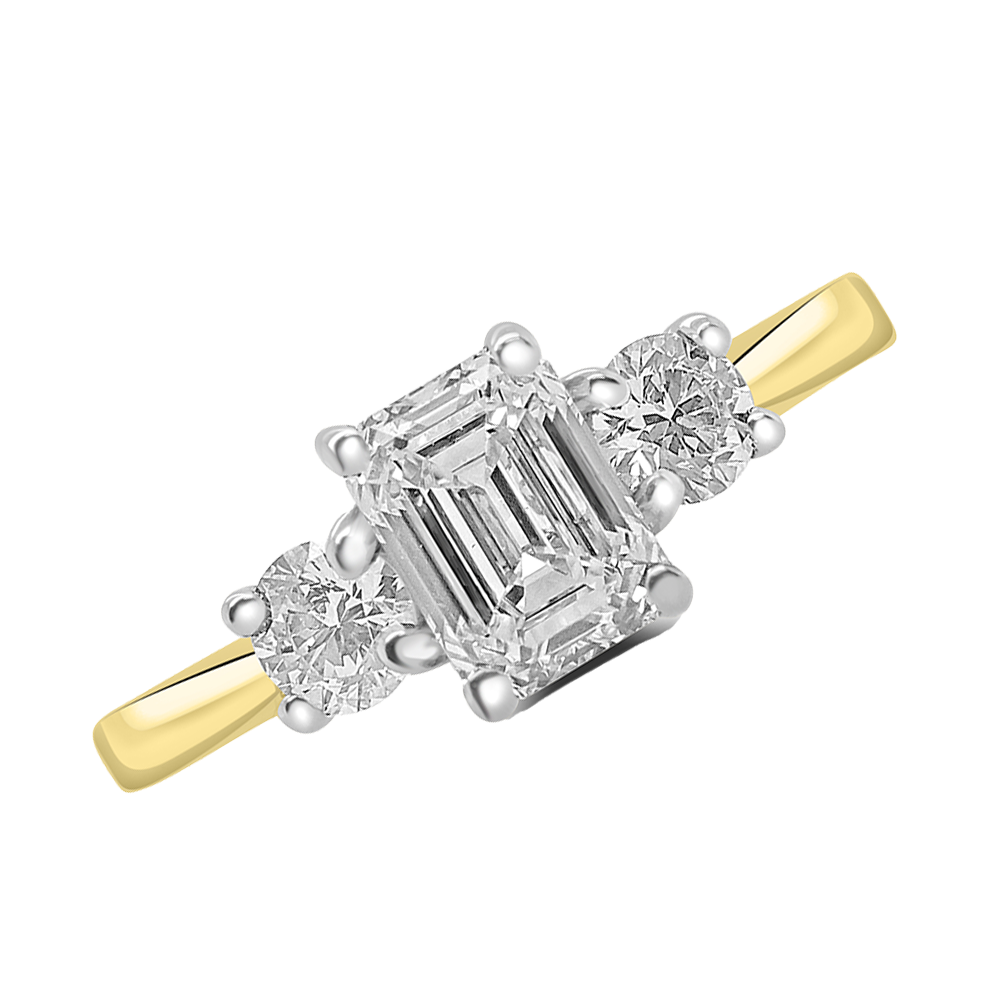 This three-stone ring features a captivating 1.30ct emerald-cut diamond at its centre, perfectly complemented by two brilliant-cut diamonds on either side with a combined weight of .46ct. Each stone is a natural GIA-certified diamond, graded F colour and VS1 clarity, offering remarkable brilliance and sophistication. The warm 18ct yellow gold band contrasts beautifully with the platinum setting.