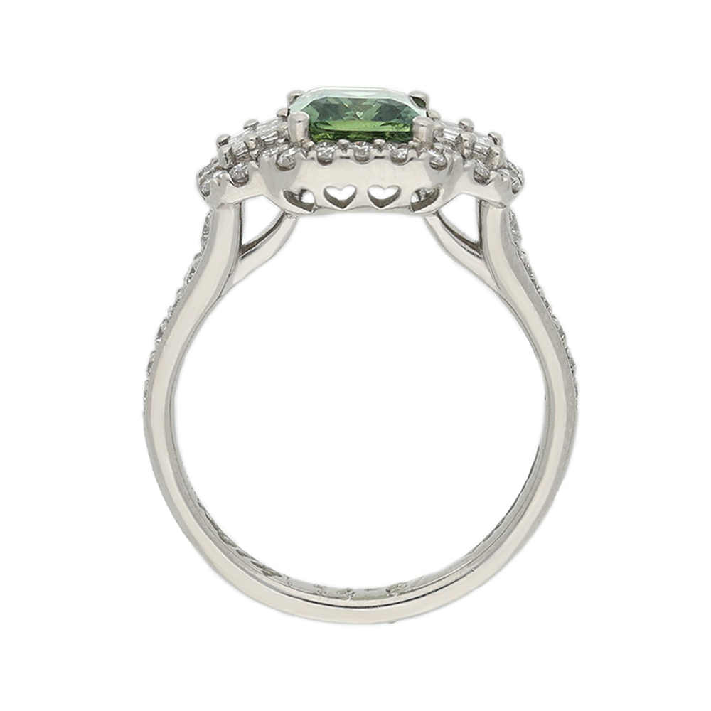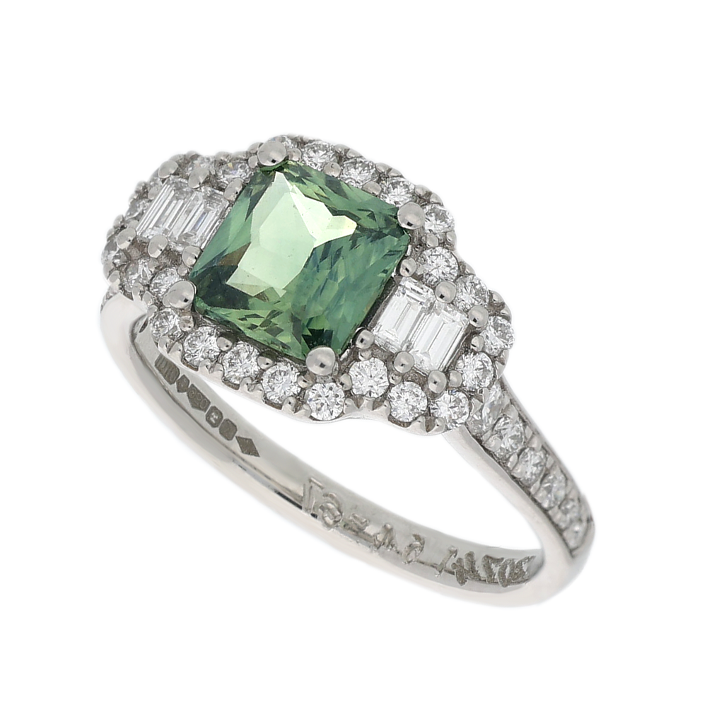 A captivating cushion-cut teal sapphire, weighting 1.54 carats, sits at the heart of this exquisite ring. The centre stone is flanked by two baguette-cut diamonds on each side, all framed by a shimmering diamond halo. The front of the platinum band is pave-set with additional diamonds, enhancing the brilliance and sophistication of this striking contemporary design.