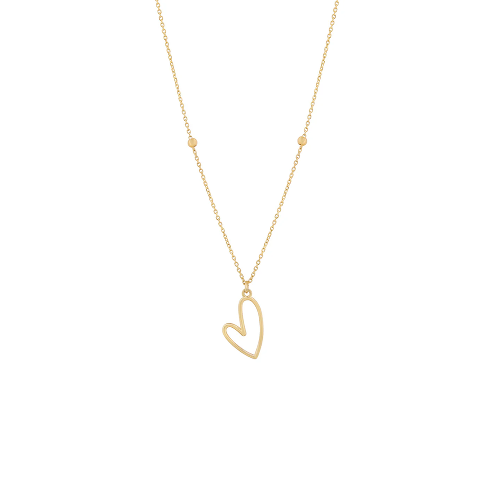 A delicate expression of understated elegance, this 9ct yellow gold necklace features a charming sketched-style open heart pendant. Two complementary yellow gold beads frame the heart along the chain, adding subtle dimension and visual interest.
