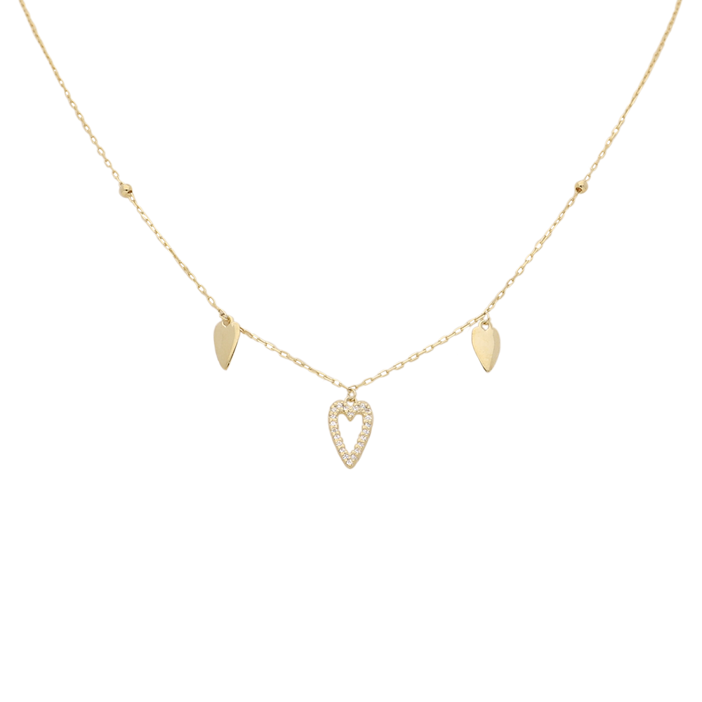 Made in solid 9ct yellow gold, this elegant necklace features a striking three-heart pendant design. The centerpiece showcases an open heart adorned with pavé cubic zirconia, creating a luminous focal point framed by two solid gold hearts. Delicate gold beads sit gracefully above the side hearts, adding refined dimension.
