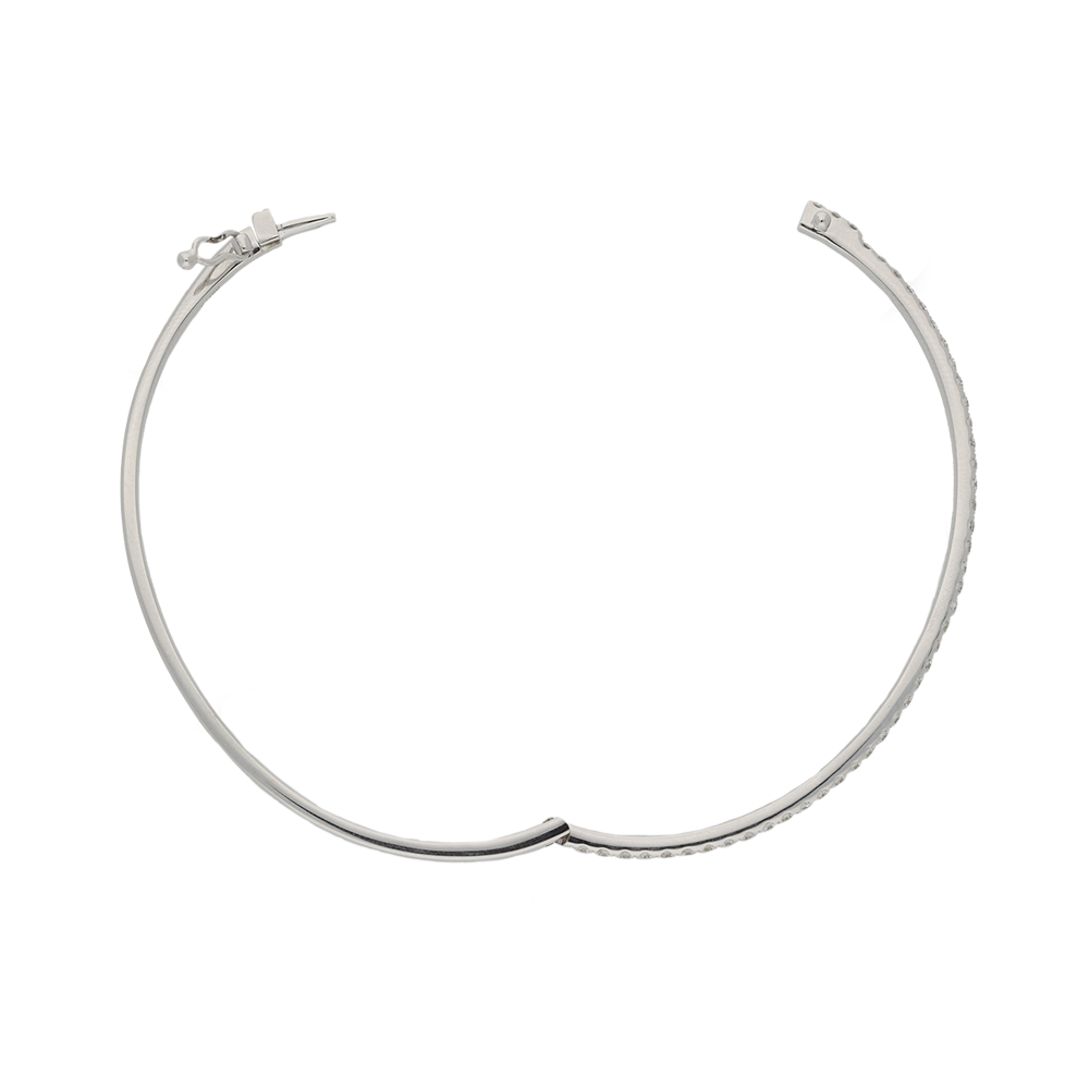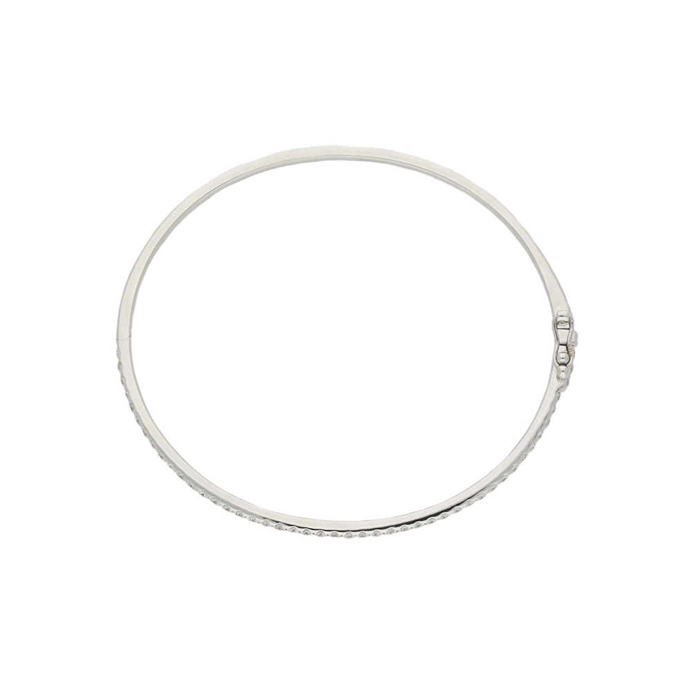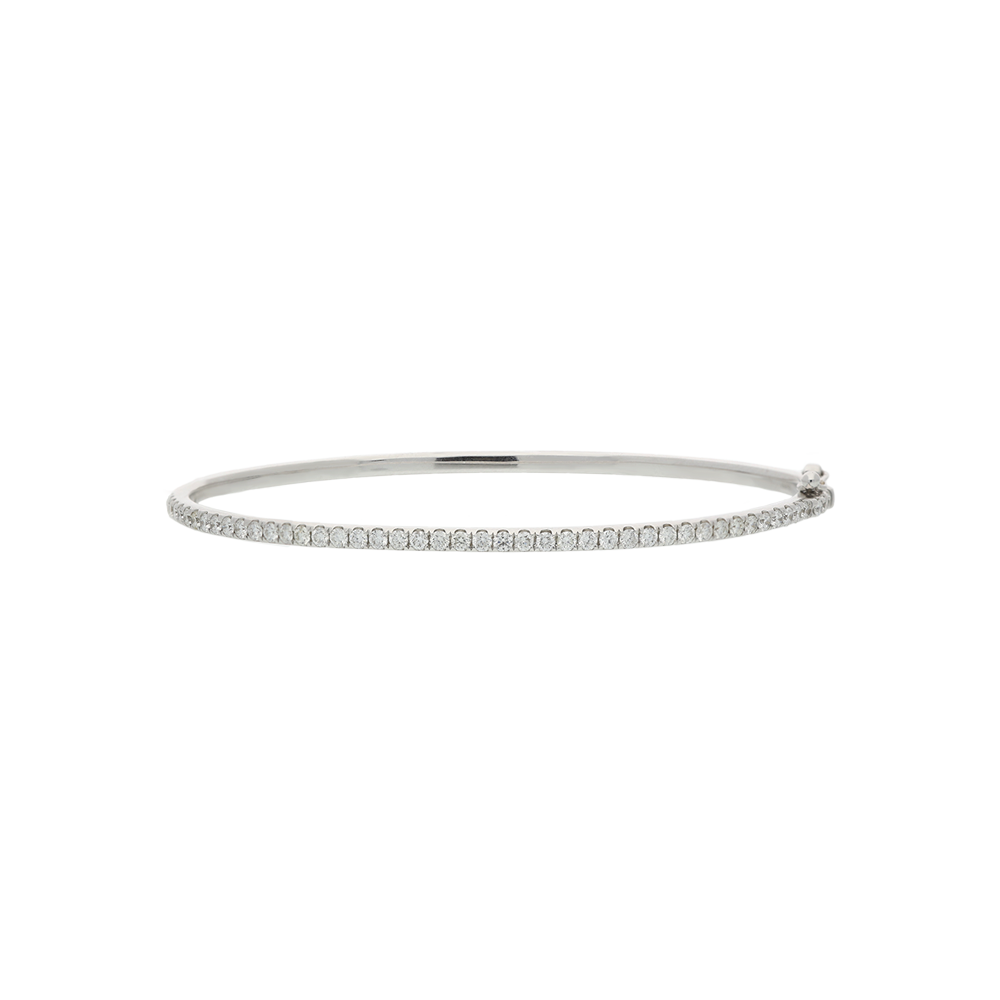 This elegant 18ct white gold bangle showcases a total of 1 carat of brilliant-cut diamonds, each expertly claw set along the front for maximum sparkle. The back of the bangle features a smooth polished finish, offering a sophisticated contrast to the diamond-adorned front. Secured with a refined barrel clasp and safety clip, this timeless piece combines classic craftsmanship with contemporary elegance.