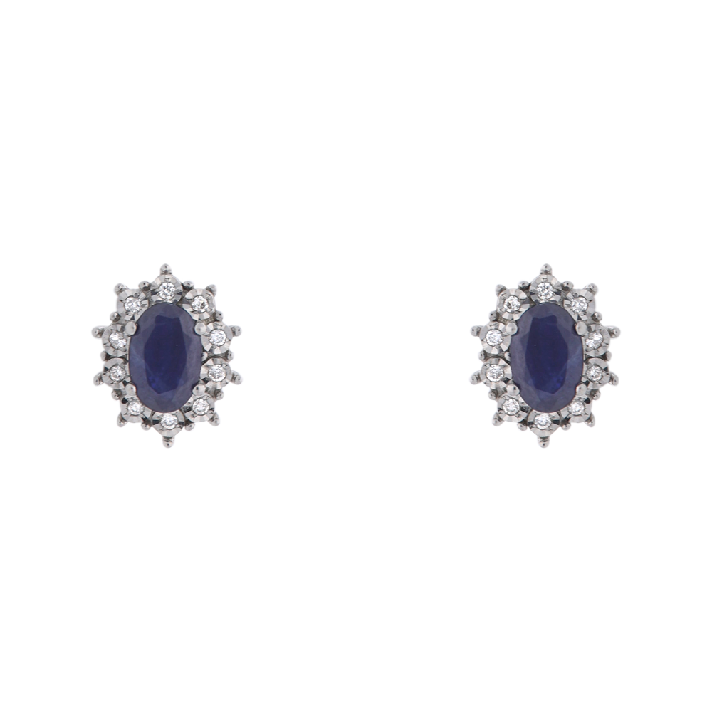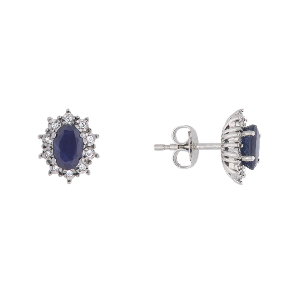 These 18ct white gold stud earrings showcase a pair of rich oval-cut blue sapphires (total weight .50ct), encircled by ten brilliant diamonds in illusion settings.
