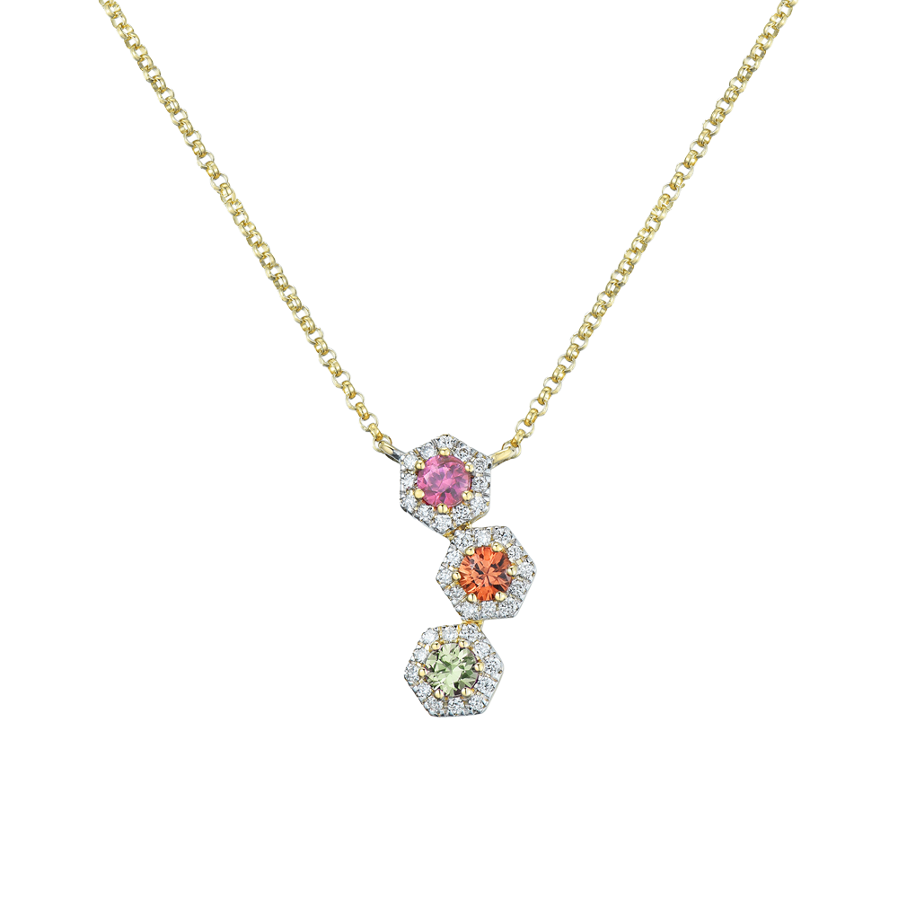The natural geometry of this 18ct yellow gold pendant showcases three vibrant sapphires in pink, orange, and green. Each sapphire (total carat weight .37ct is framed by a hexagonal halo of pave-set .11cts of diamonds.