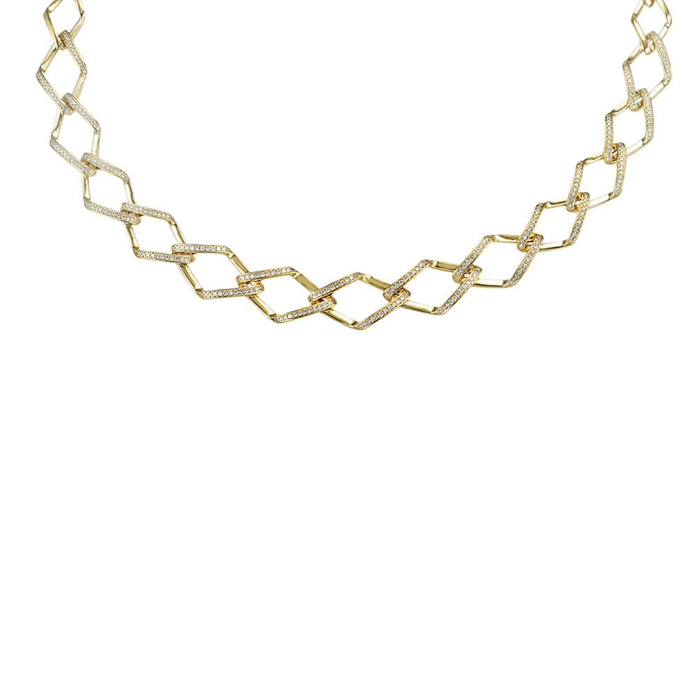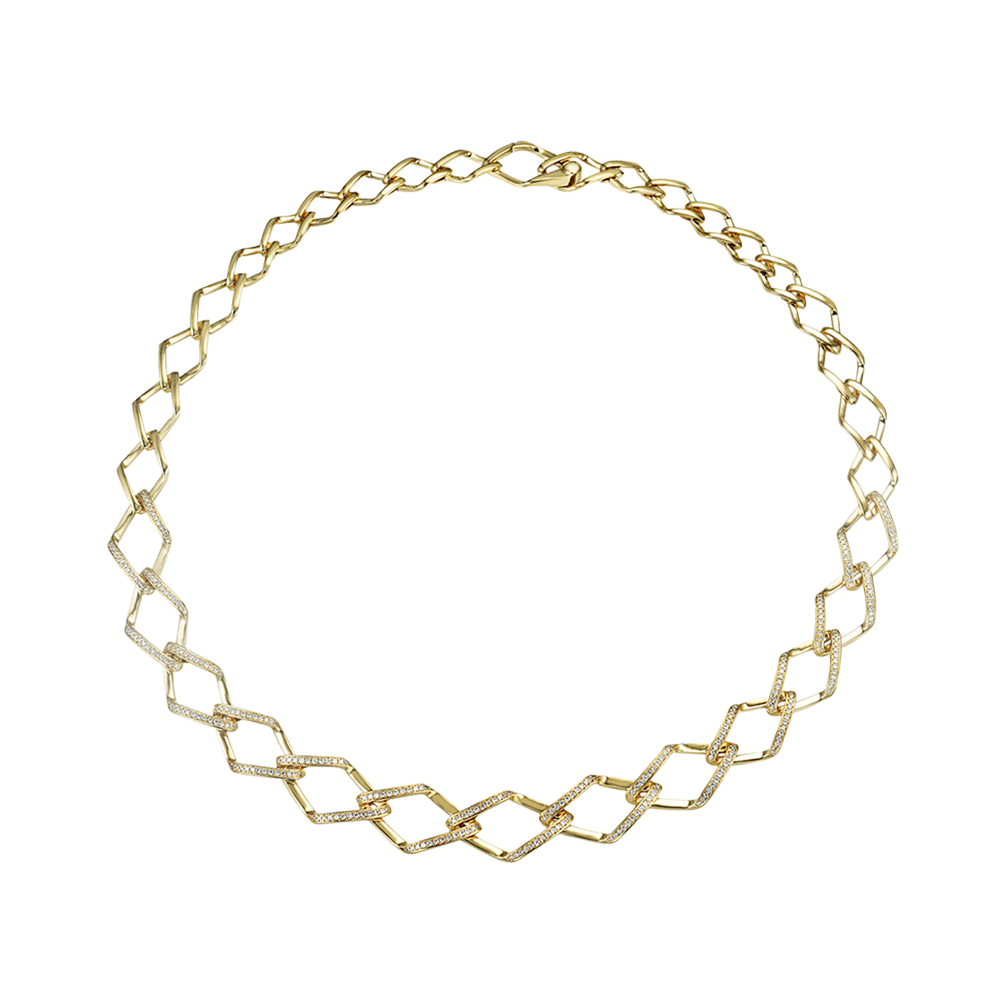 A striking reinterpretation of the classic chain, this 18ct yellow gold necklace is composed of open-diamond shaped elongated links, many of which are lavishly pave-set with brilliant-cut diamonds totalling 1.47ct. The geometric silhouette gives a contemporary edge, while the warm glow of gold and the scintillation of diamonds create a look of refined luxury.