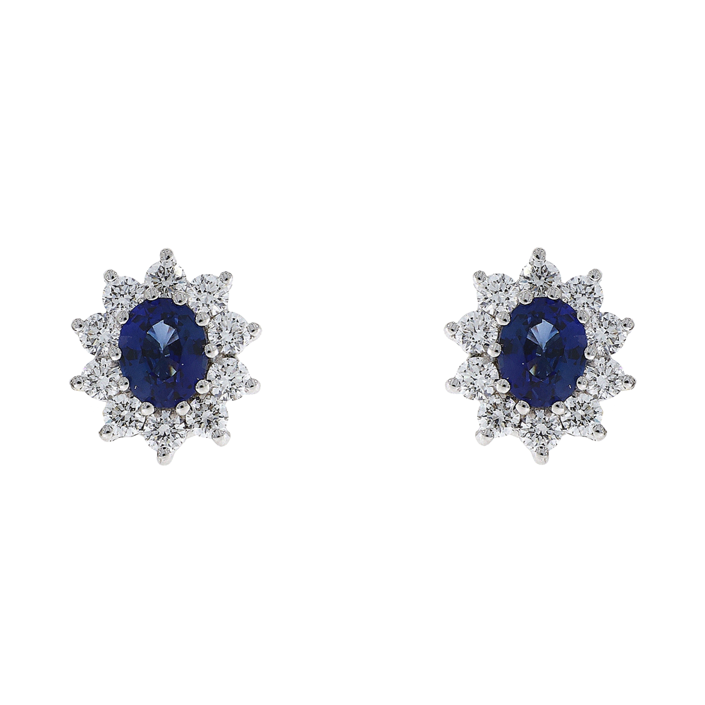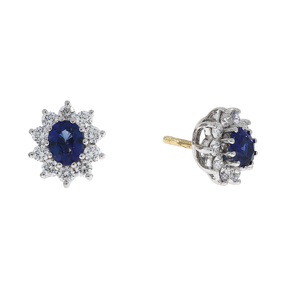 These exquisite 18ct yellow gold stud earrings, each earring features a vibrant oval sapphire, encircled by a halo of dazzling diamonds. With a combined total carat weights of 3.10 carats in sapphires and 1.79 carats in diamonds