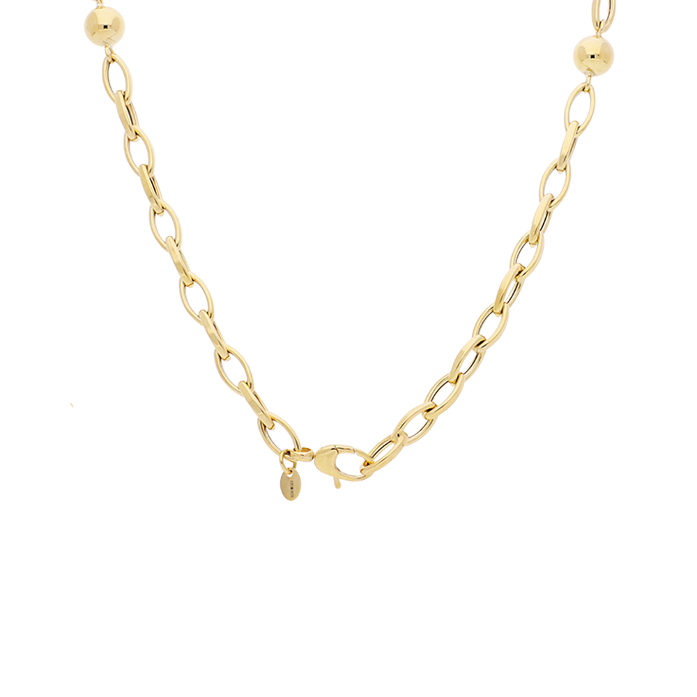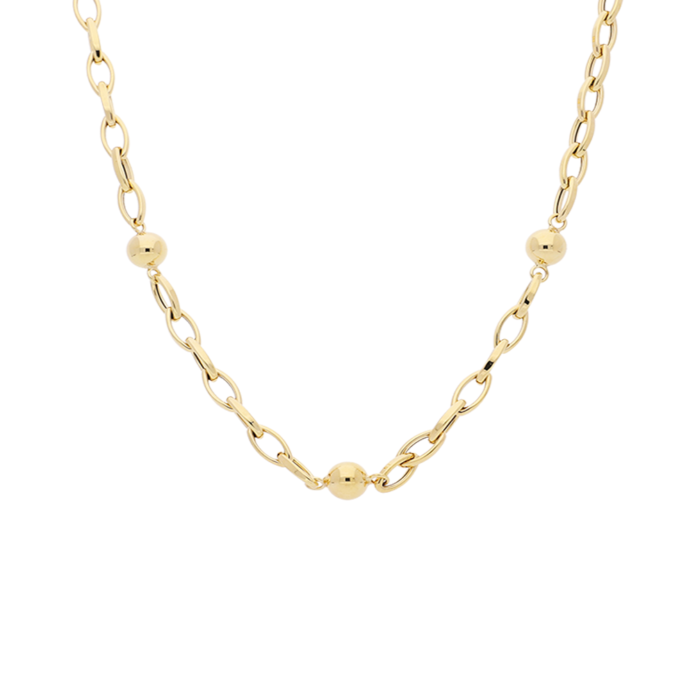 This 9ct yellow gold necklace features an elegant combination of sleek oval links and polished gold balls, creating a distinctive and luxurious design. At 80cm in length, it offers a versatile, draped style that can be worn long for effortless sophistication or double layered look.