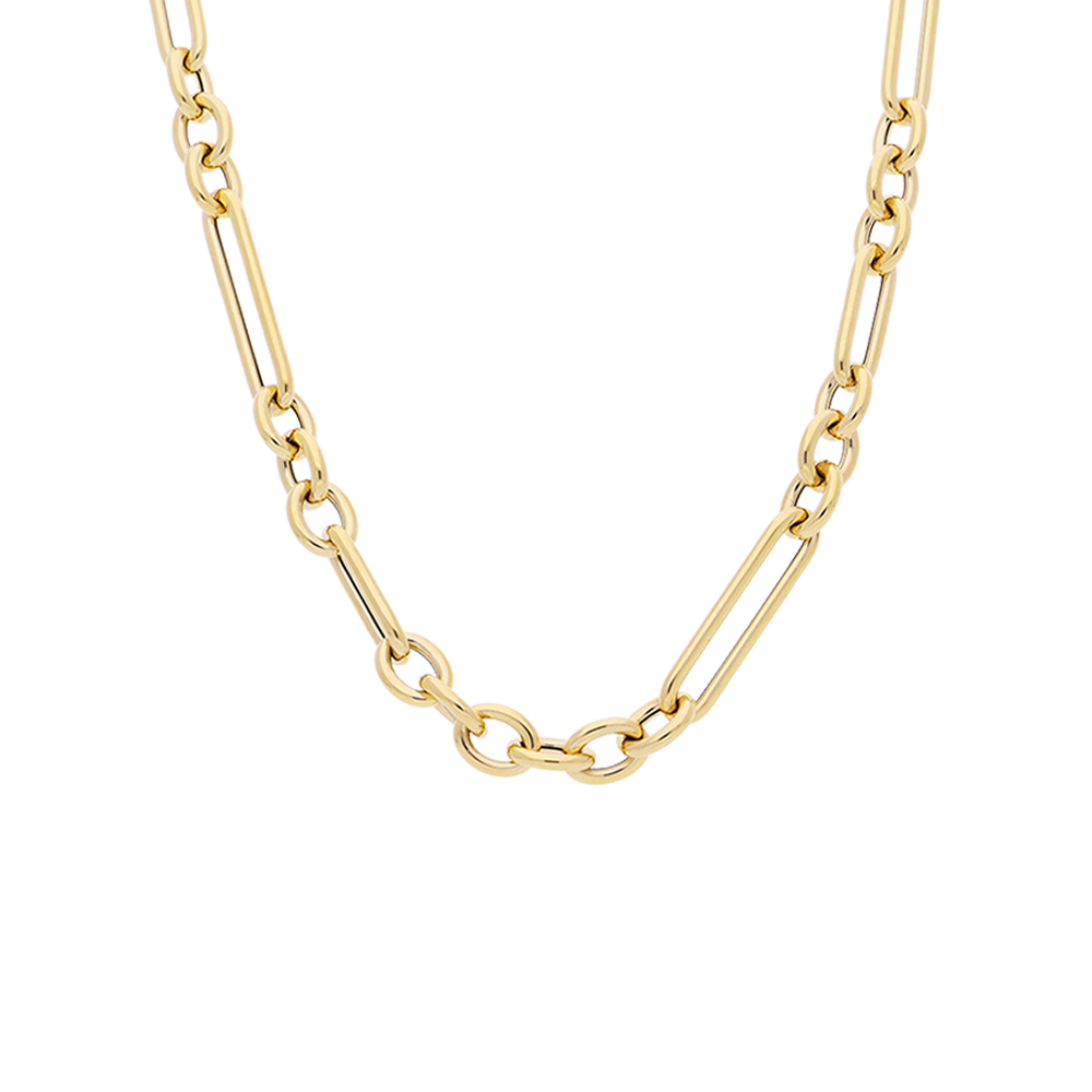 This 9ct yellow gold T-bar necklace showcases a refined mix of elongated oval links and smaller round links, creating a balanced interplay of shapes and textures. The polished finish enhances the golds warm glow. Measuring 45cm in length, it sits beautifully along the neckline, making it a versatile piece.