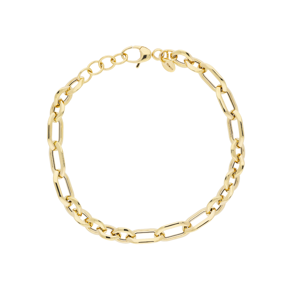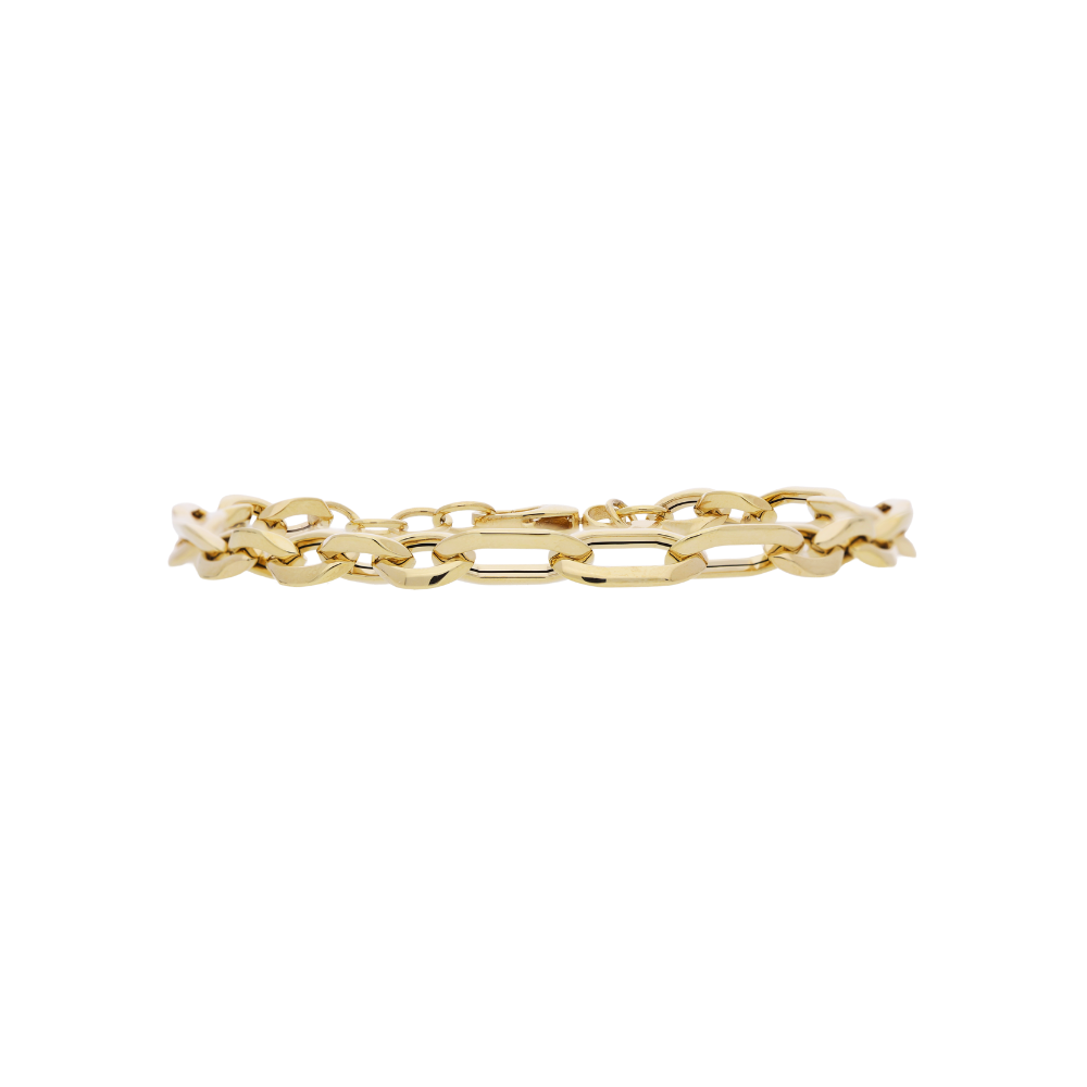 This 9ct yellow gold bracelet combines classic elegance with a modern twist, featuring smaller round links and larger squared oval flat links. Measuring 19cm, it offers a secure and comfortable fit while showcasing a polished finish that enhances the warm golden hue.