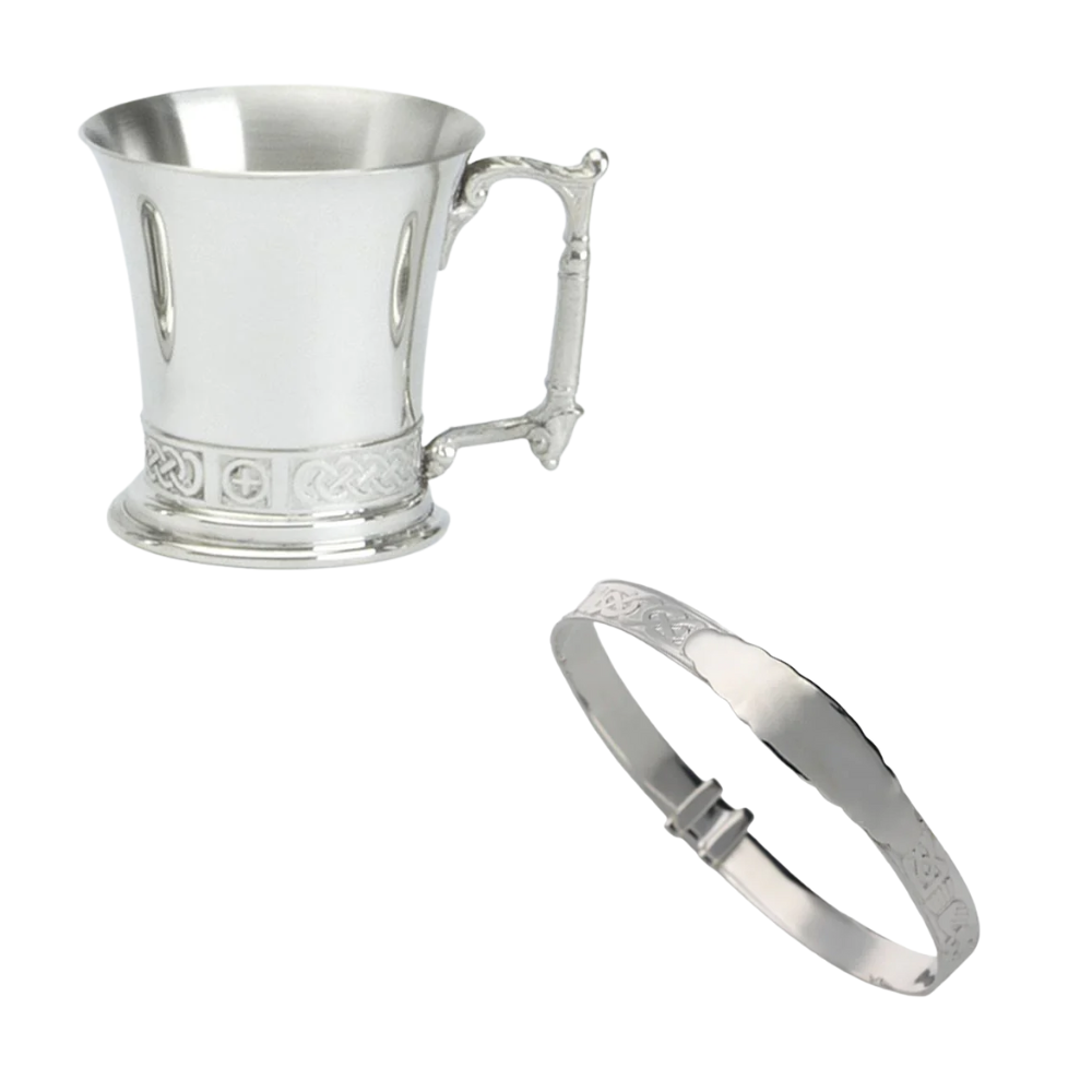 Celebrate life’s earliest milestones with a timeless keepsake. Our Sterling Silver Celtic Baby Bundle combines two pieces – a beautifully crafted Sterling Silver Celtic Baby Bangle and an elegant Pewter Celtic Christening Cup.