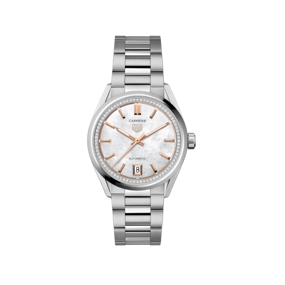 Experience the elegance of the TAG Heuer Carrera Date 36mm Watch, model WBN231C.BA0001. This exquisite timepiece has a 36mm case and a white mother-of-pearl dial, beautifully framed by 76 diamonds. The rose-gold plated indexes and hands add a touch of sophistication, while the sapphire case back showcases the watch's intricate mechanics. Perfect for those who appreciate sophisticated precision.